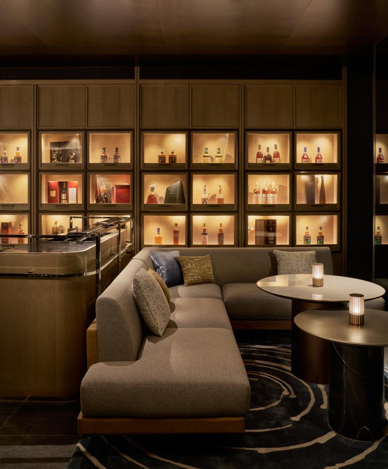 The journey then extends outward into two terraces, one alive with social energy, the other steeped in quiet contemplation. The larger Main Garden centers on a golden armillary sphere, its interlocking rings tracing cosmic orbits in a timeless expression of harmony and motion. Outward-facing seats encircle this sculptural centerpiece in a gesture of openness, extending the lounge’s embrace toward the views beyond, while a mix of seating styles invites guests to gather, mingle, and play. In contrast, the Star-gazing Garden offers a more intimate retreat: a tucked-away outdoor living room where cozy arrangements welcome couples and small groups. Here, the atmosphere turns romantic and contemplative, drawing the eye—and the spirit—upward to the night sky.