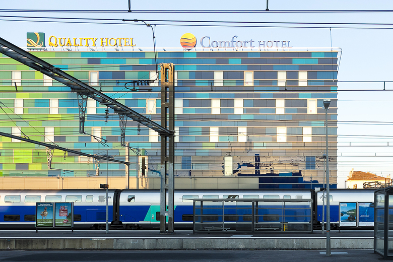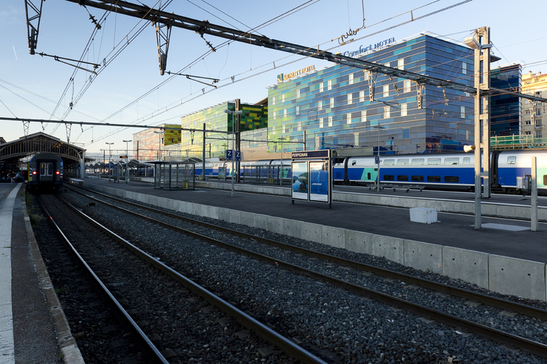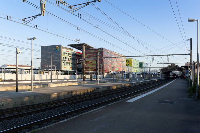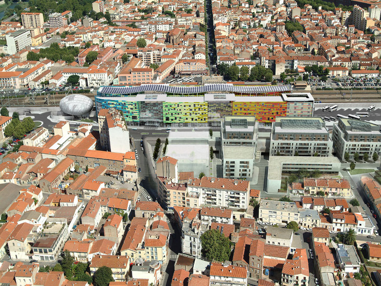 The New Nuclei Area of the TGV [high speed train]station,which includes the multi-purpose complex (shopping centre, hotel and offices)is the element around which the municipal townplanning operation to revitalise Saint Assiscle revolves and makes the new station an intermodal centre of urban development and the new economic driving force of the city. This district is separated from the centre and its surroundings by the fracture caused by the railway line and the SNCF station.