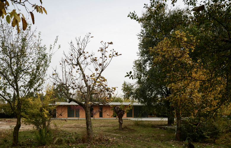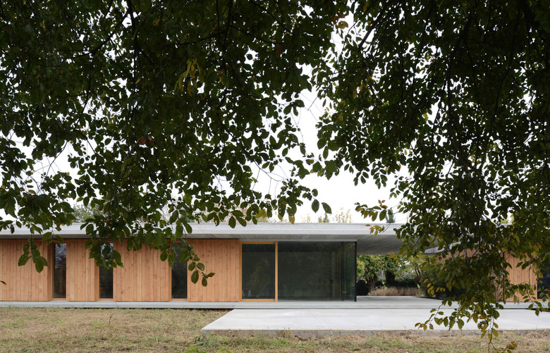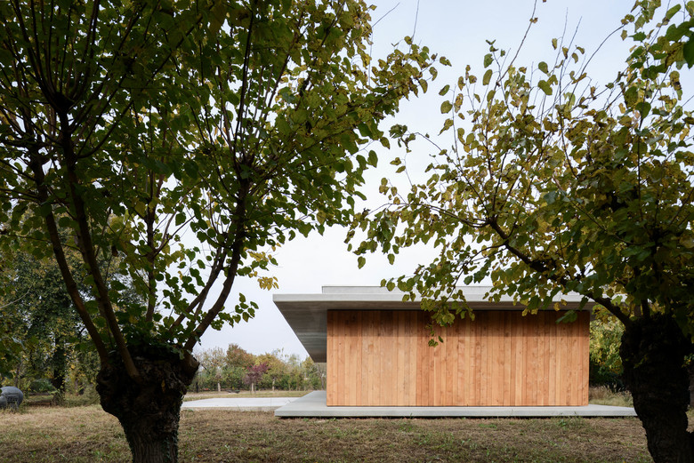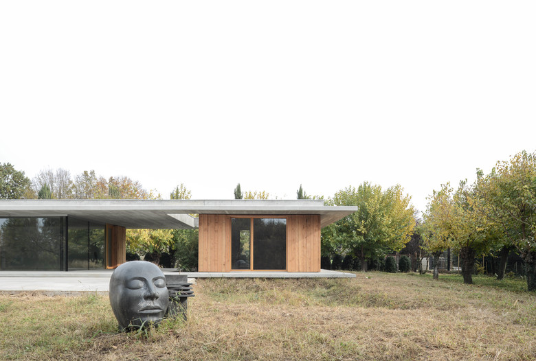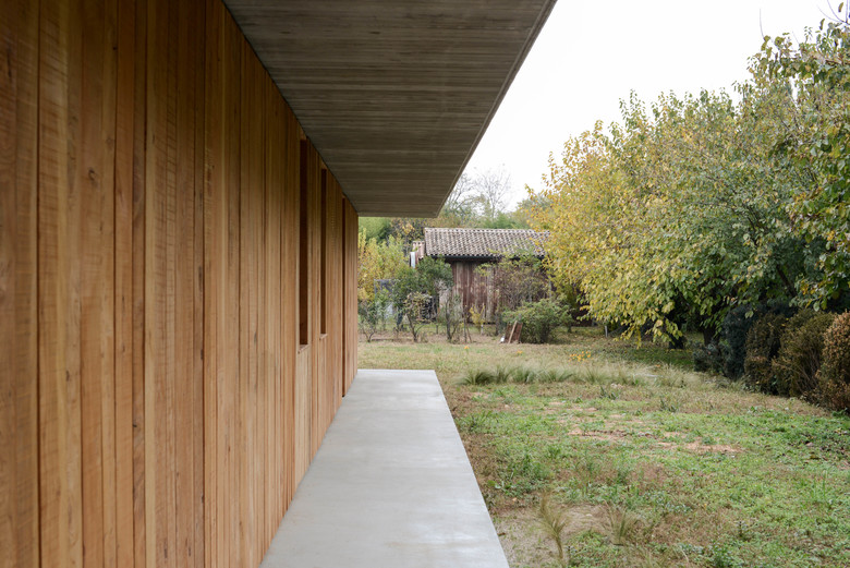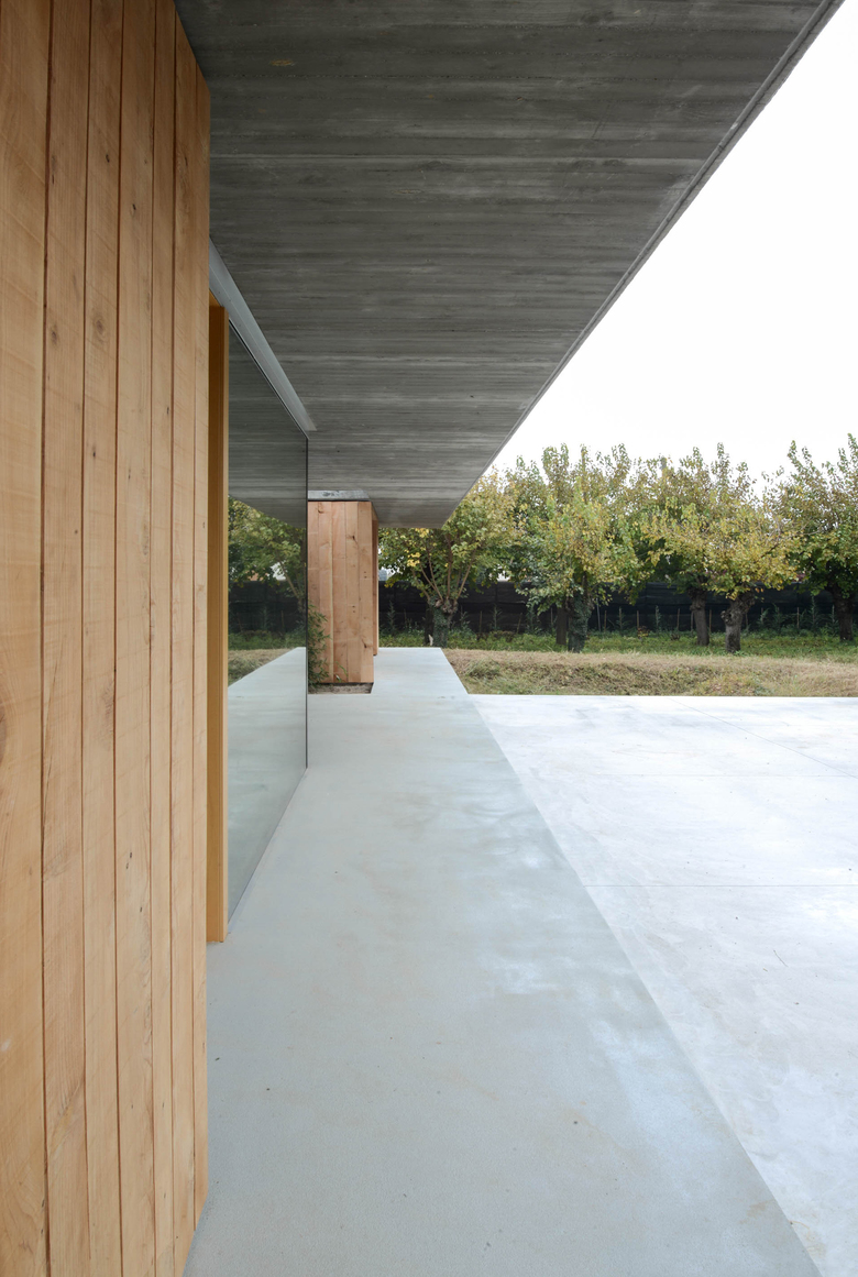 L'idea progettuale nasce dalla volontà di valorizzare il contesto esistente, immergendo delicatamente la nuova abitazione nel verde: due sottili linee orizzontali parallele ne limitano basamento e copertura, "proteggendo" al loro interno la "scatola abitativa". Quest'ultima, rivestita totalmente in legno, garantisce al progetto un elevato livello d'integrazione con l'ambiente circostante, ed attraverso grandi aperture vetrate permette un rapporto di continuità con il grande parco verde circostante.