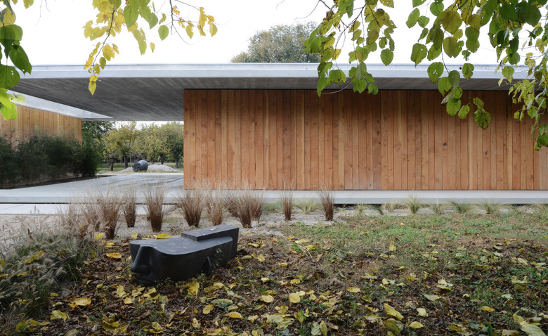 L’utilizzo equilibrato di materiali semplici come il calcestruzzo a vista con una particolare matrice, per soffitto e pavimento, e le doghe in legno di cedro (a rivestimento dei blocchi abitativi), contribuiscono ad esaltare la semplicità volumetrica dell’abitazione, conferendole una raffinata eleganza.