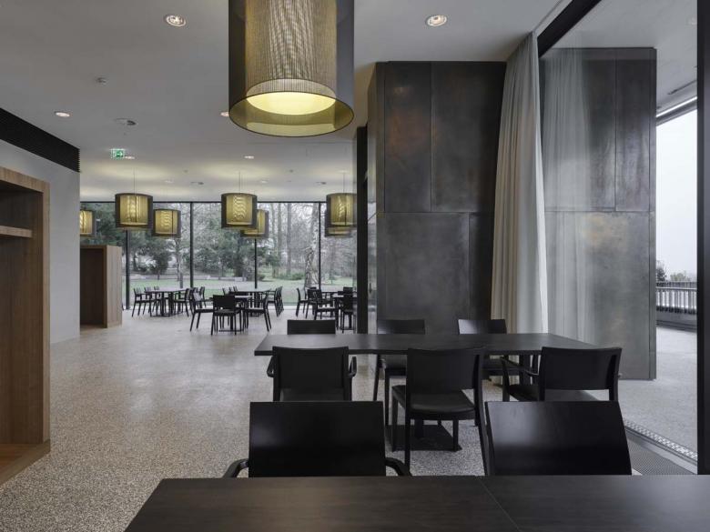 Möbelartige Einbauten in Nussbaumholz zonieren die Eingangshalle und definieren den angestrebten Grad an Offenheit und Transparenz zwischen nordseitigem Eingangshof und südseitiger Terrasse. Im Rahmen der Gesamterneuerung wurde der Komfortsteigerung grosse Bedeutung beigemessen. In den Obergeschossen konnten grosszügige Aufenthaltsbereiche geschaffen und die Mehrbettzimmer in Einer- und Zweierzimmer mit direkt zugeordneten Nassräumen umgewandelt werden. Kombinationen von hochwertigen Materialien und Oberflächen mit schlicht gehaltener Farbigkeit erzeugen eine wohnliche Atmosphäre. Panoramafenster mit schmalen Lüftungsflügeln inszenieren die grossartige Aussicht über die Stadt und das Limmattal. Die teilungsfrei ausgeführten grossformatigen Fenster verleihen der Anlage einen zeitgemässen Ausdruck und machen die Erneuerung des Pflegezentrums auch von aussen erfahrbar.