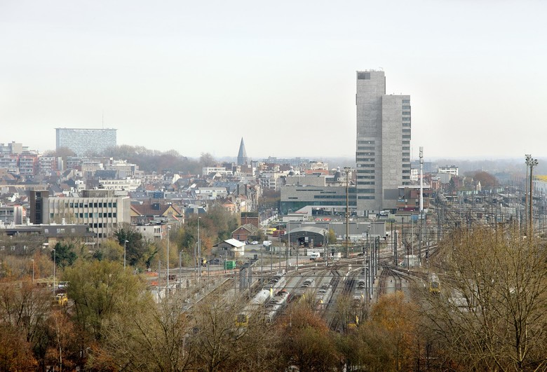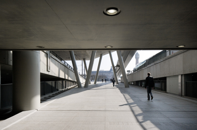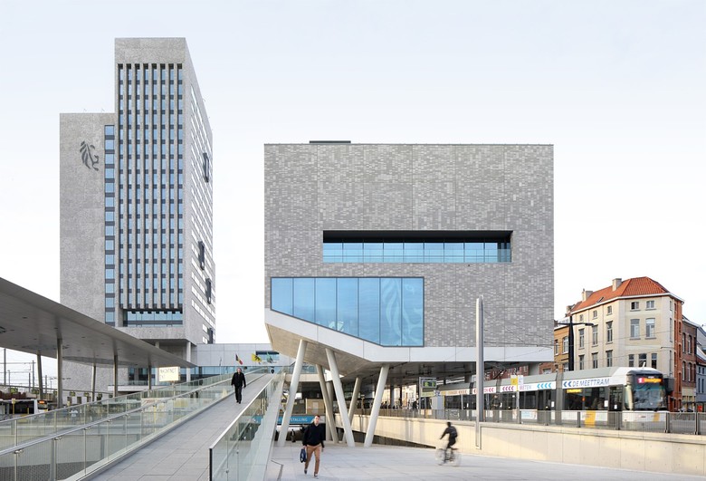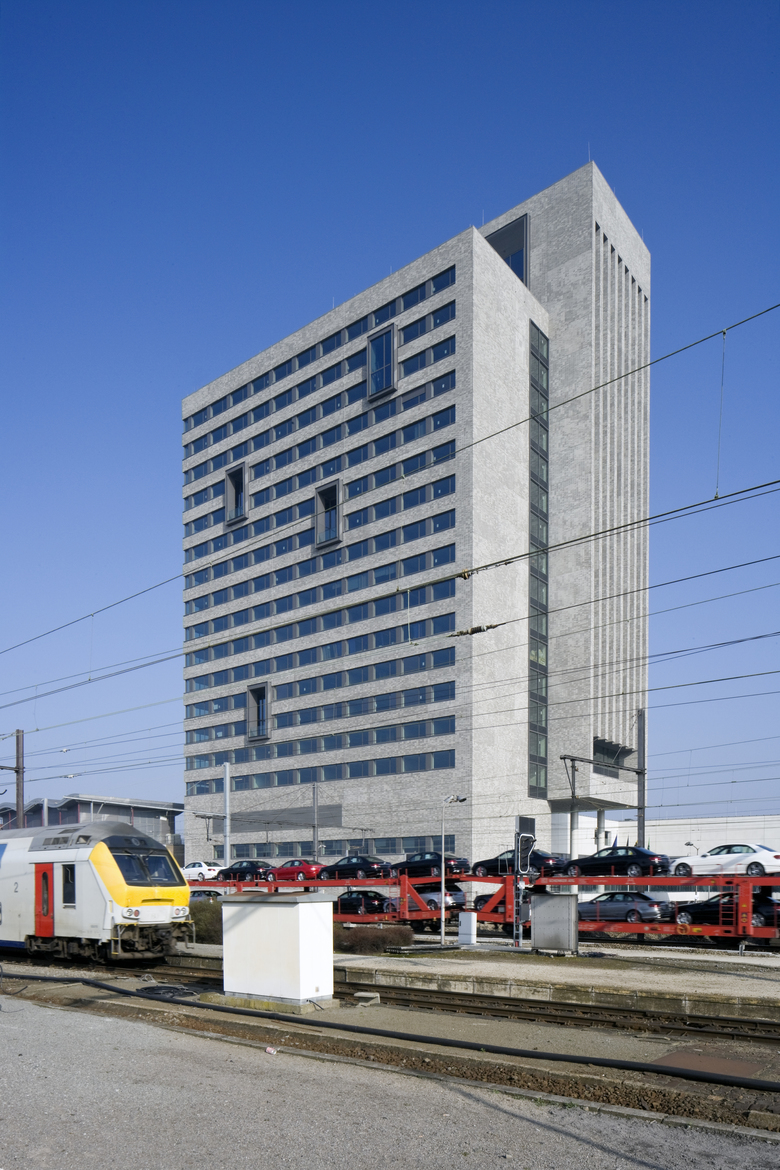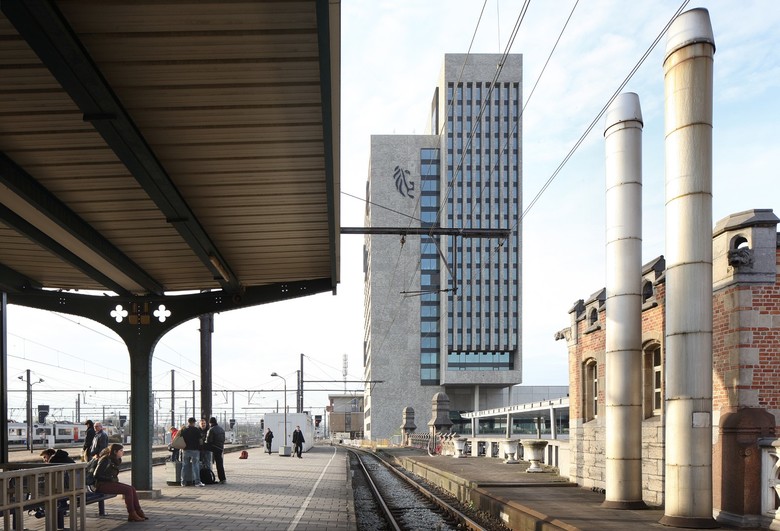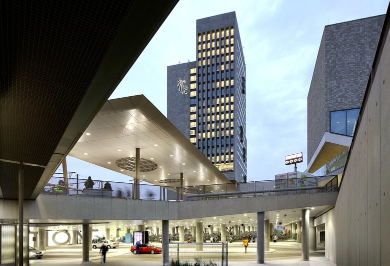 In enkele gestes biedt het winnende ontwerp een antwoord op een aantal complexe stedelijke uitdagingen. De eerste uitdaging bestaat erin om het kantoorprogramma te combineren met het transferium voor openbaar vervoer. Om te vermijden dat het drukke verkeer het publieke karakter van de toren hindert, bevindt de inkompartij zich ter hoogte van een opgetild, stedelijk voorplein. Het verhoogde maaiveld zweeft boven het transferium. Het neemt afstand van de drukte en biedt rust en overzicht. Het betreden van het gebouw wordt zichtbaar door de markante hellingbaan die vertrekt aan het stationsplein. Onder het gebouw bevindt zich een parkeergarage voor de pendelaars.
