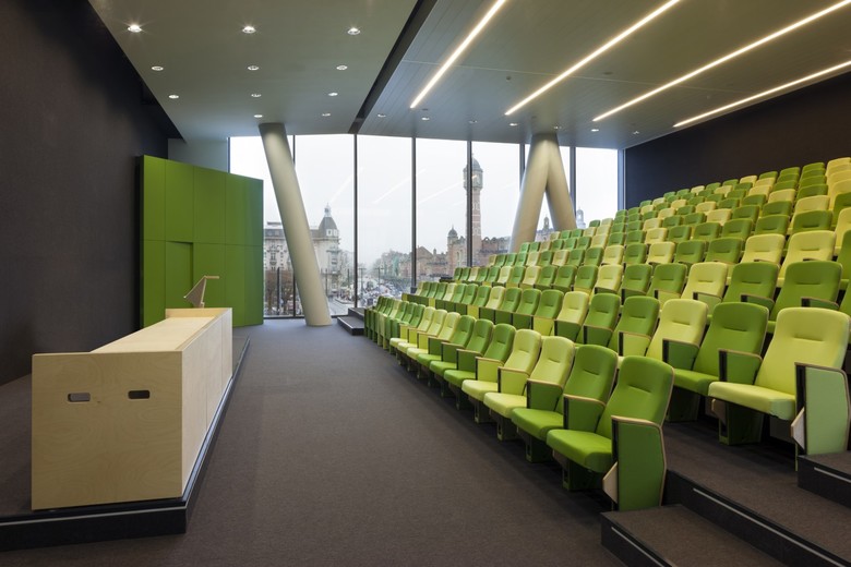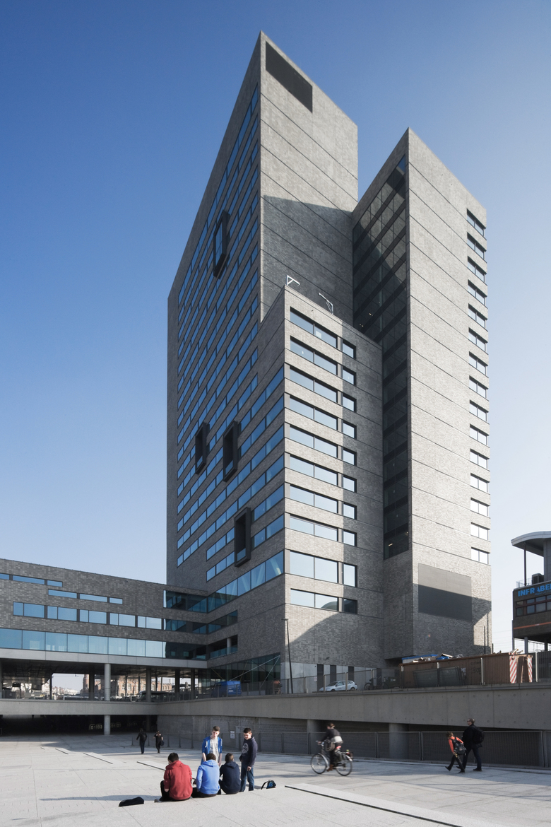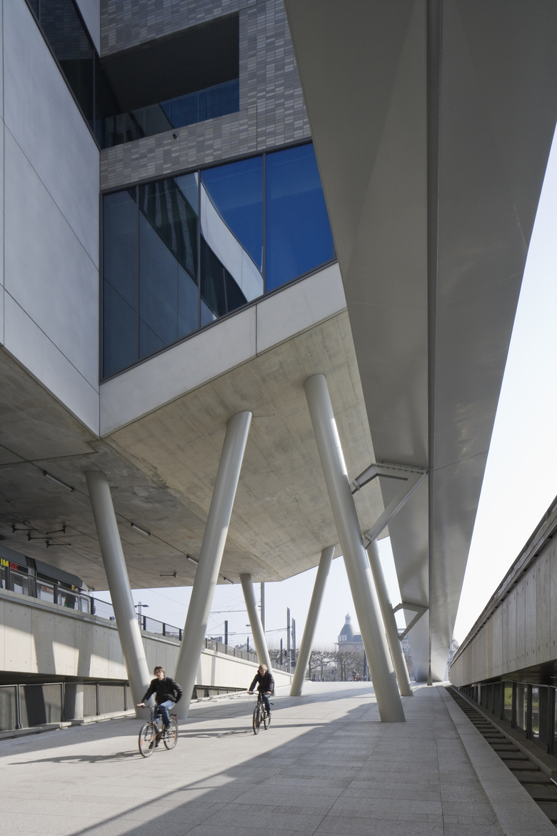 De woningen langs de Koningin Fabiolalaan kijken tegen een meer bescheiden gebouw aan, terwijl de toren hoger wordt, en dus slanker lijkt. De indruk van een slanke toren is nog verder versterkt door de toren op te delen in twee geschrankte volumes. Het auditorium, zichtbaar gemaakt in een uitkraging en in de grote glazen vensters, benadrukt het publieke karakter van de arm.
