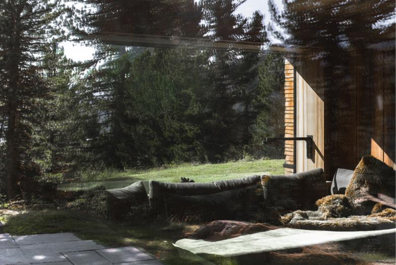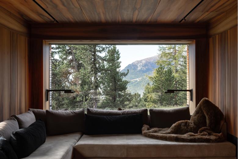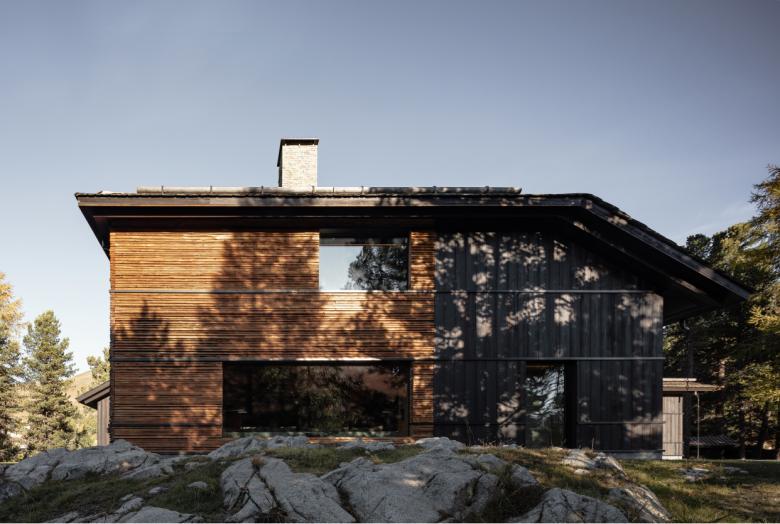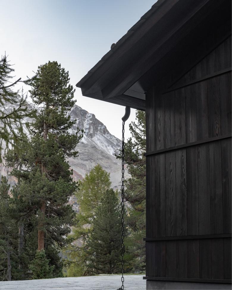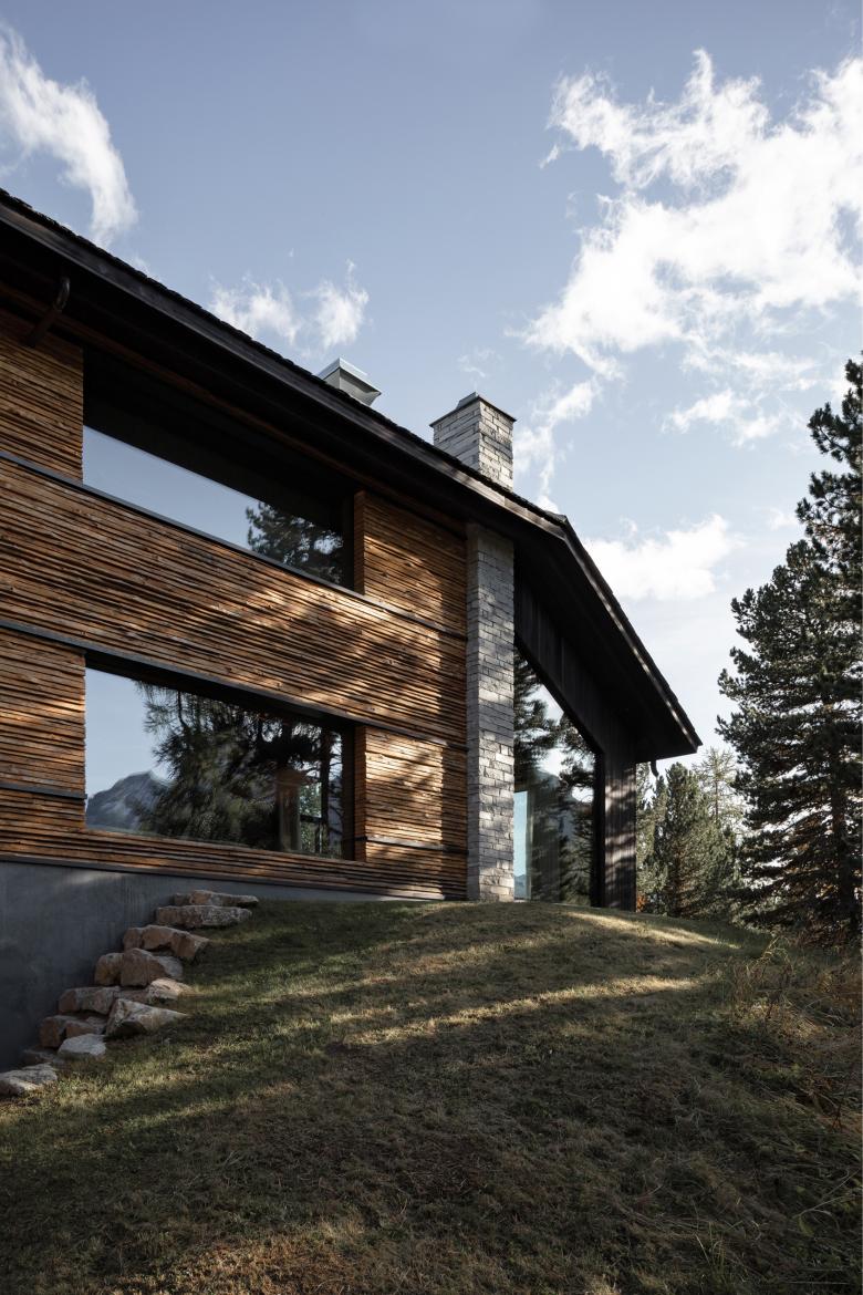 The chalet echoes traditional Alpine buildings with its tripartite structure of stone plinth, wooden walls and slate roof. The façade design, however, is a new departure. Executed in local timber, it forms a composition of alternating horizontal and vertical lines that reflect the contours of the landscape. Horizontally cut wooden tree trunks and vertical sandblasted planks are combined with horizontal bronze profiles to form a design that is elevated by its quality of execution: The wooden planks, for example, were carefully selected to avoid knots, which would have detracted from the clean lines of the composition. Varying window sizes and treatments – some placed in invisible frames, others in recessed bronze boxes – add to the depth of the design. A rustic chalet becomes a refined piece of architecture.