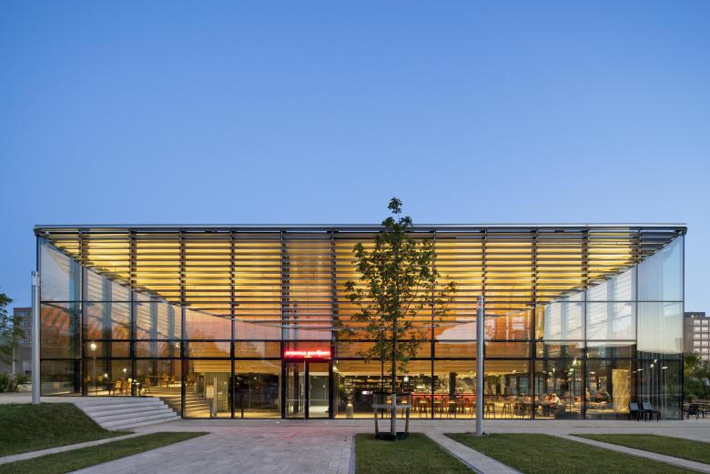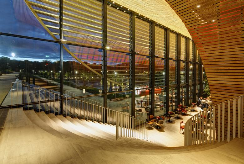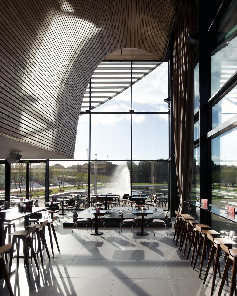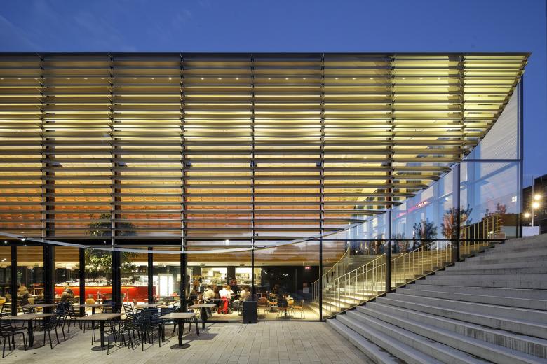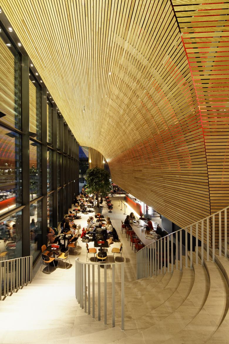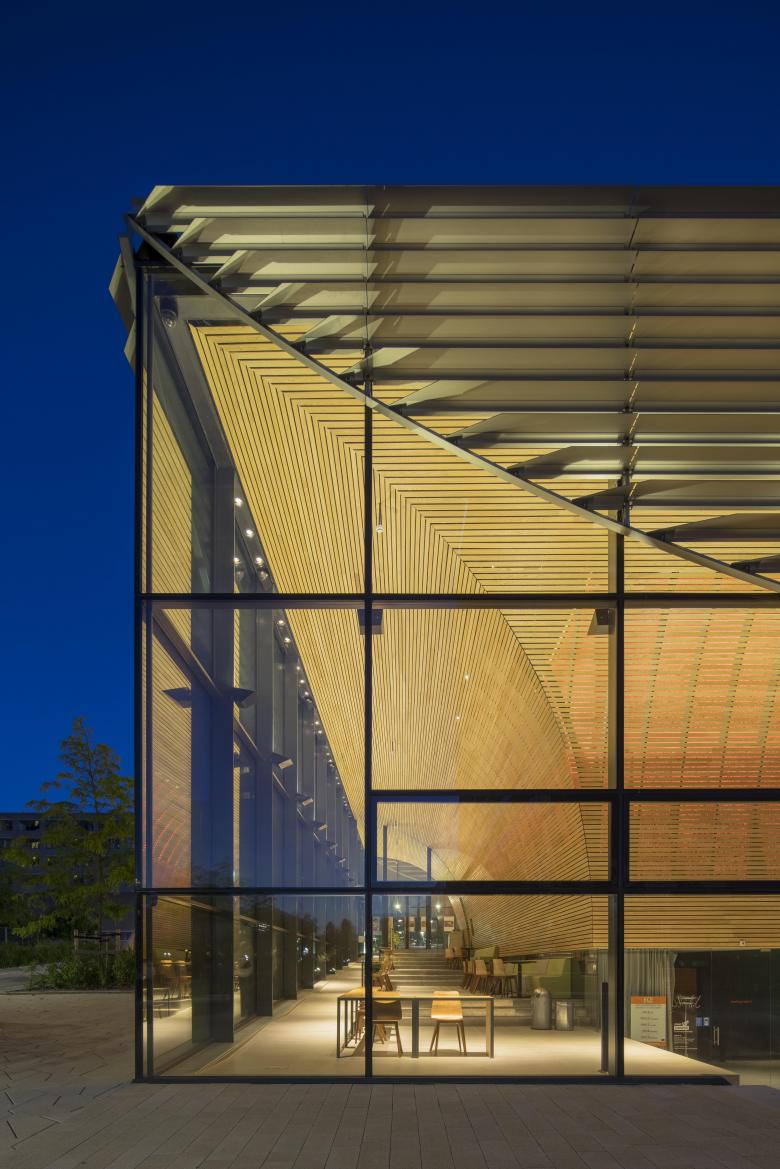 The completed pavilion – won through a competition in 2010 – forms the vibrant and central gathering space; for research to meet business and science to meet culture. The building is at once a café, restaurant, bar, study zone, meeting centre and multi-purpose auditorium.