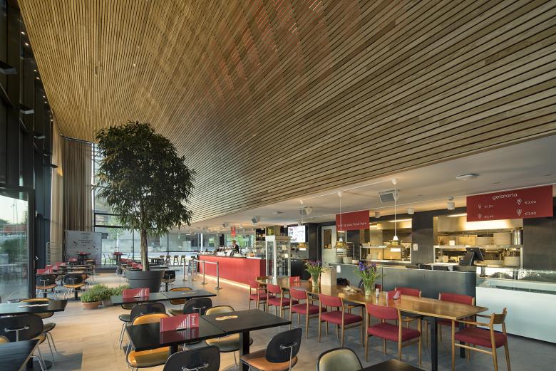 For all the building's openness, however, it was important to create an intimate and inviting environment. As well as the undercroft sections in the Grand Café, the architects added a semi-barrel vaulted suspended ceiling with groin corners around the auditorium. This lath structure – constructed from American red oak– makes an eye-catching feature and softens the materiality of the internal spaces. Furthermore, the red acoustic wall finish behind (a product named ‘Sprayplan’), which glows through the slats at night, provides essential sound absorbing qualities.