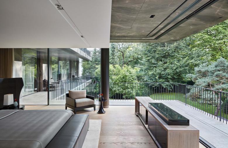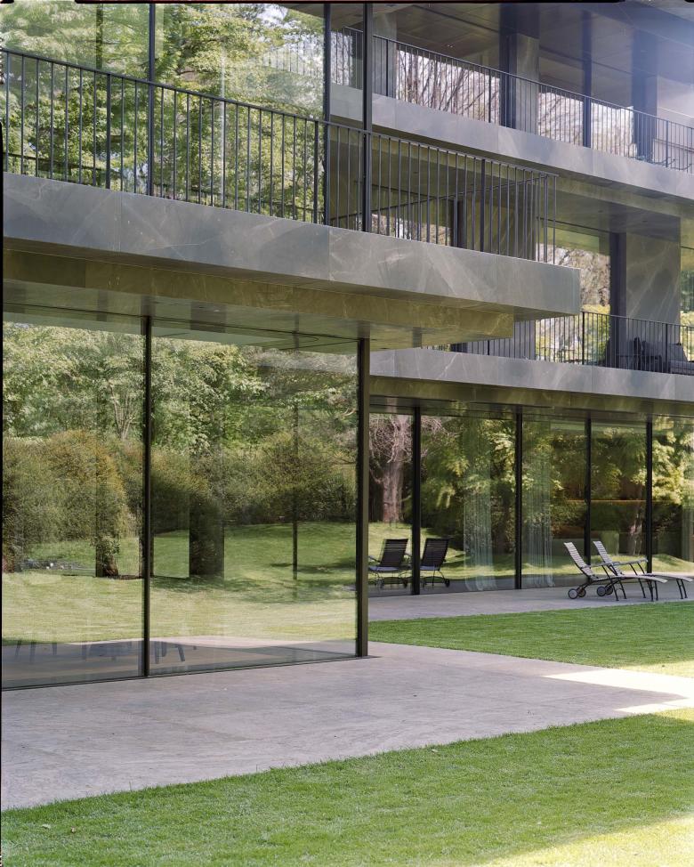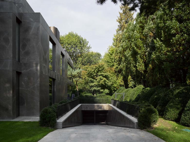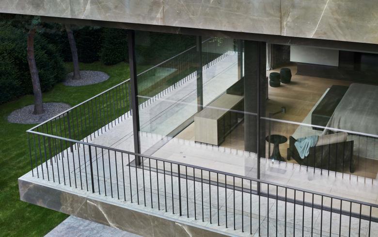 Because of its monumental facade facing the street, the house doesn’t require a wall or gate for privacy. The house stands free and fully visible while simultaneously offering privacy for the interior. The garden was designed with a natural chain of trees and bushes to create an array of lush green spaces around the house. An old Japanese Acer tree stands majestically in front of the imposing marble facade and creates a beautiful play of shadows on the sheets of natural stone. At the back of the house, the crowns from a group of Pinus sylvestris trees create a natural response to the stark horizontal lines of the balconies projecting into the garden.