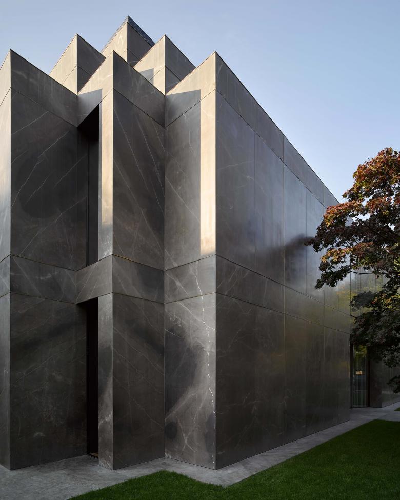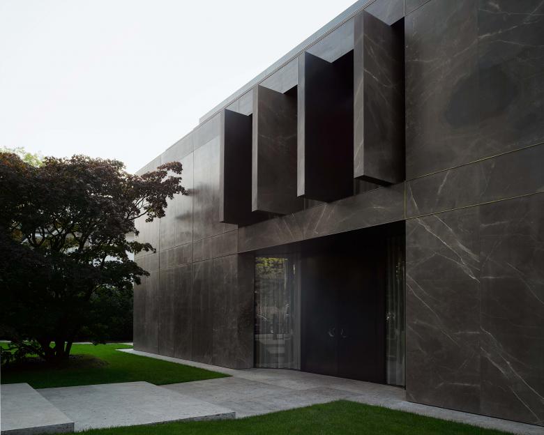 In early conversations with the client, the design team used the Hooper House II by Marcel Breuer as an inspirational foundation, because of its unusual use of dark natural stone and large abstract openings. They also decided to work with large pieces of natural stone, because of the impressive feeling of solidity that they give and how each stone displays its own character. From there, sketches were developed, displaying a vertical structure closed from the street yet horizontal and open to the garden. Influences from the early modernist architecture of Adolf Loos and Mies van der Rohe guided the design approach for the plan and facade. The combination of these two contrasting spatial logics—together with a classical idea of distribution—played a focal role in the design process.