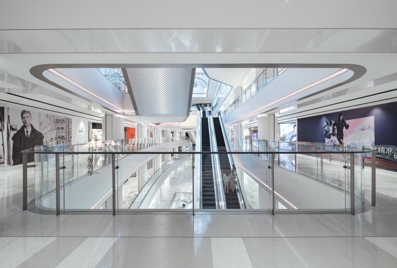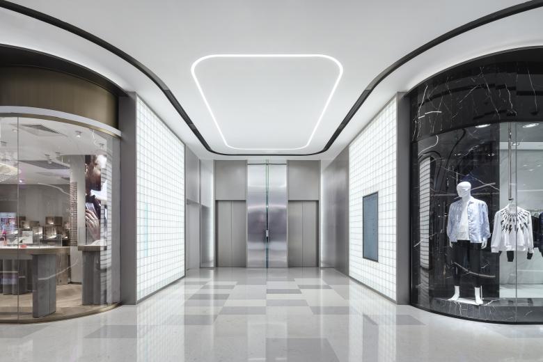 The design approach of breaking up the big-box mall continues inside the space, where a formerly vast atrium is now dissected by a mezzanine. Because lower levels’ flagship custom made facades allows for greater light control as opposed to upper floors’ abundance of transparent glass, the platform creates two distinct atmospheres, signalling shoppers’ journey between fashion below, and F&B above. The renovation also shifts visitor flow from up and down, to through the space thanks to escalators at the mall’s two entrances, both of which have been configured to anticipate their likely demographic. For example, the East entrance opens into a lifestyle space due to its proximity to Nanjing Xi Lu subway station. The West entrance is close to nearby luxury shopping destination Plaza 66, and guides visitors towards thematically similar high-end fashion.