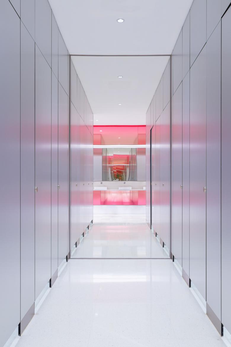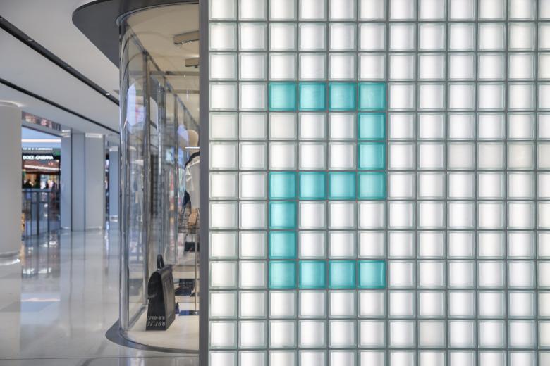 Like a secondary circulation tracking that of shoppers, LED screens run throughout the atrium in an infinite loop. Fully customizable, they update the mall into a dynamic multimedia space. Resembling a pulsating data flow, they reinforce CITIC SQUARE’s pixel theme to digital, literal, and futuristic effect. The design trope is revisited in an abstract way in striking lift lobbies, where walls of glass bricks create impactful pixelated numbers.