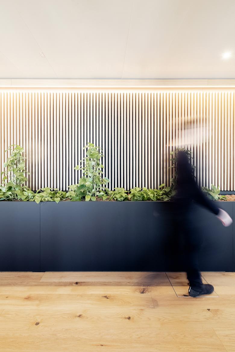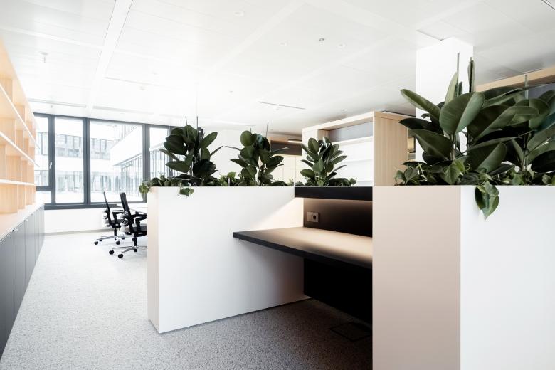 Für die Einrichtung der Homebases für ruhiges Fokusarbeiten setzen wir auf das bewährte Konzept der von uns entwickelten Open Space Furniture. Durch die mikroperforierten oder stoffbezogenen Oberflächen generieren wir eine hervorragende Raumakustik. Die Sockel der Vertäfelung werden alternierend zur Sitzbank für kurze Meetings oder zu Pflanzentrögen für ein guten Raumklima. Es entsteht ein abwechslungsreicher Rhythmus, der der die längeren Flurfluchten auflockert.