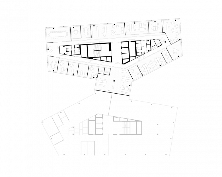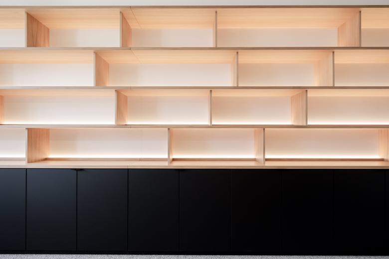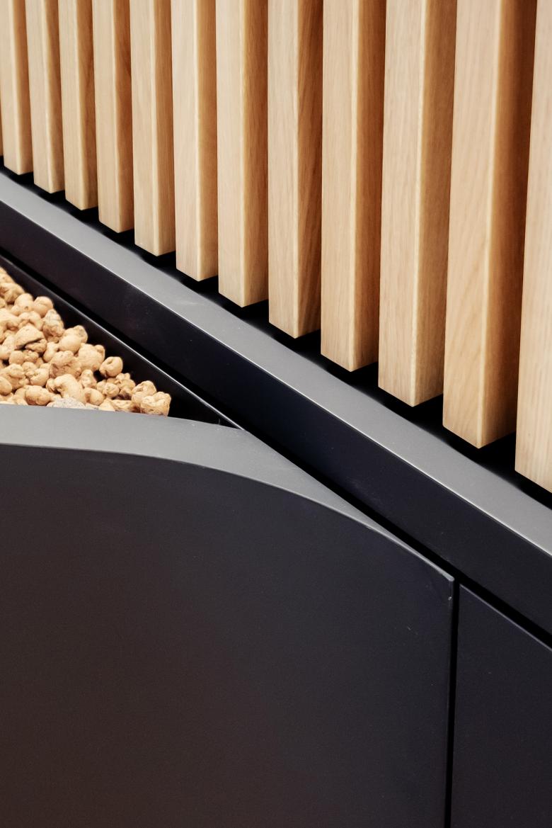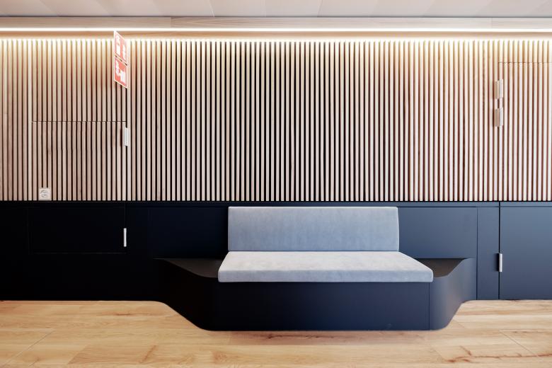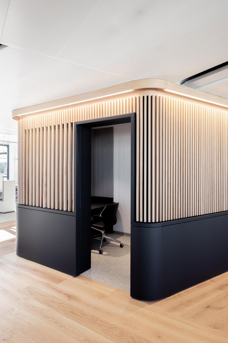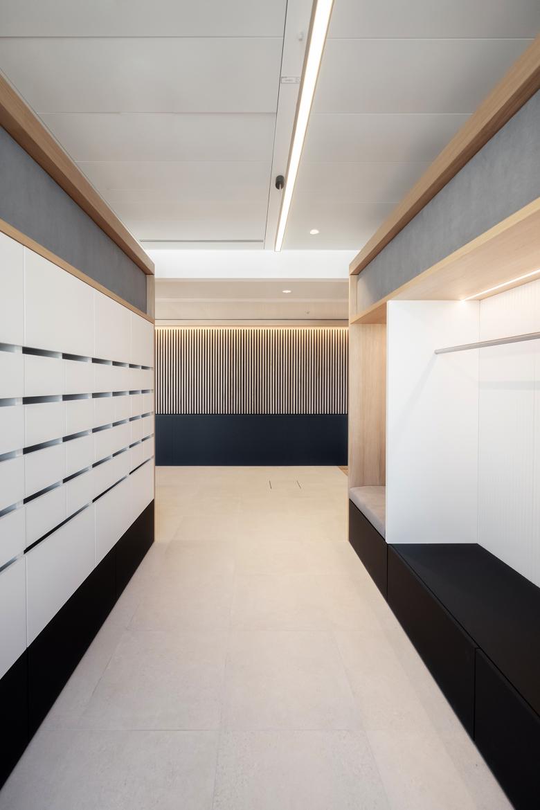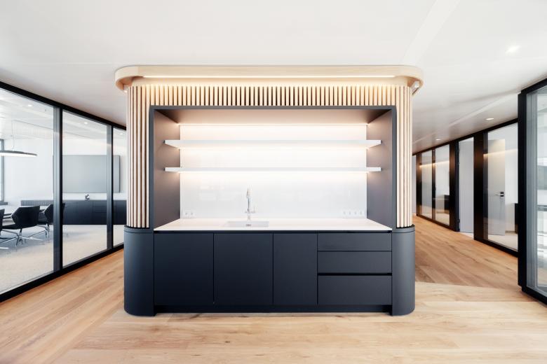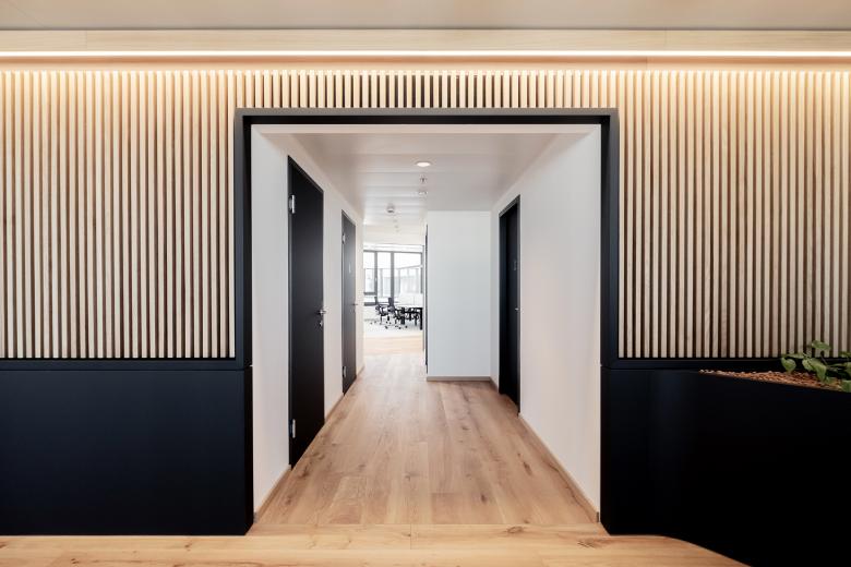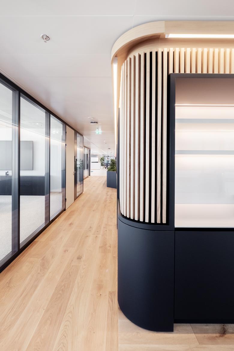 Ein funktionaler Kern, die gemeinsame Mitte, bietet Orientierung und Halt. Die elegante Farbwelt in Braun, Schwarz, Weiß schafft Ruhe und Konzentration. Zeitlose Gediegenheit: Der funkionelle Kern des Büros wird mit einer Lamellen-Vertäfelung umschlossen, die sich zu Räumen, Gängen, Sitzbänken, Garderobe und Regalen öffnet.