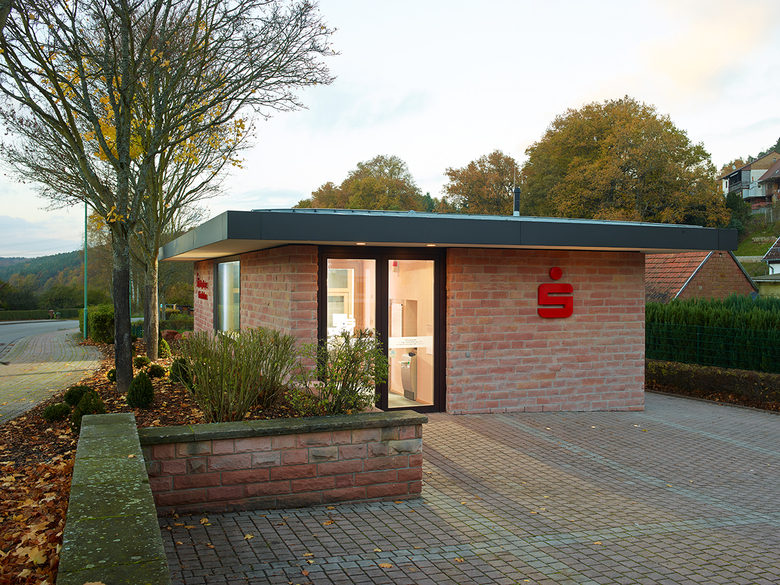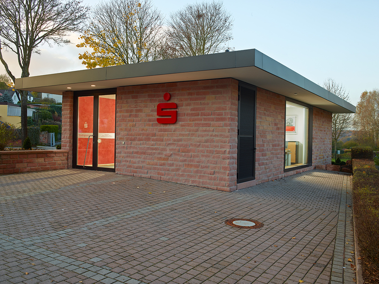 Der im Juni 2013 fertiggestellte Neubau befindet sich auf einem bereits bestehenden Platz und wertet diesen architektonisch auf. Die eingeschossige Pavillon-Architektur mit dem markanten, weit auskragenden Dach entwickelt sich aus der bestehenden Umfassungsmauer heraus und schließt das nördliche Ende des Platzes ab. Durch die Platzierung der Sparkassenfiliale am rückwärtigen Ende des Platzes bleibt viel öffentlicher Raum erhalten.