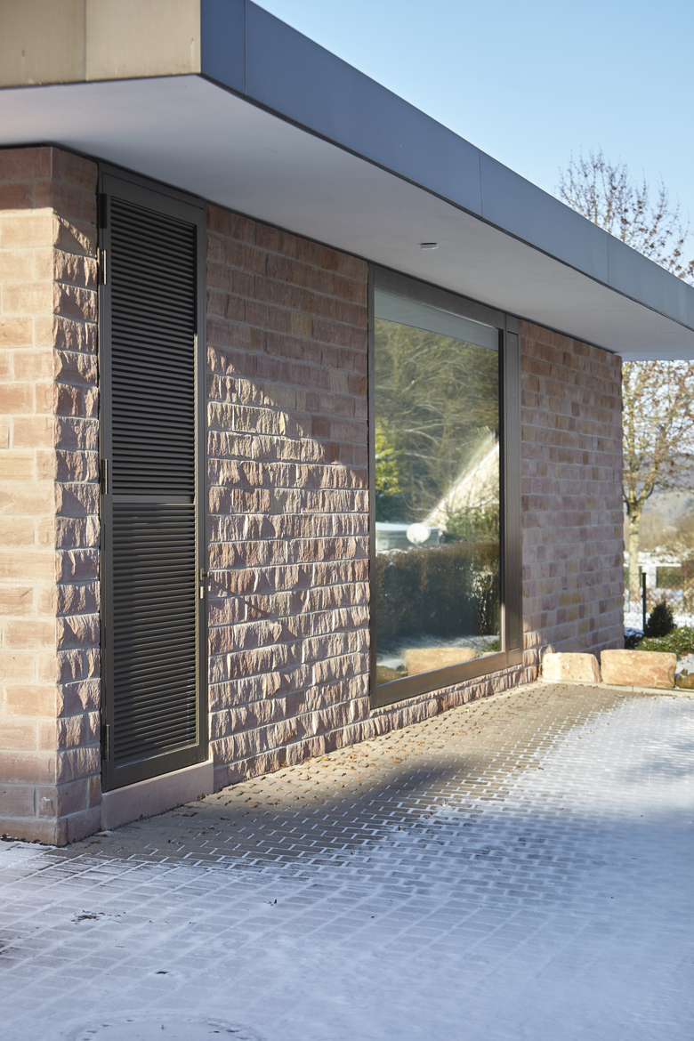 Die neue Fassade wurde, ebenso wie die Umfassungsmauer, aus einem lokalen Sandstein angefertigt, um so ein harmonisches Gesamtbild zu erreichen. Das Natursteinwerk Picard - nur etwa 15 Kilometer vom Bauort entfernt - konnte Material liefern, das sich in Farbe und Beschaffenheit der Oberfläche optimal an die vorhandene Mauer anpasst. Das Ergebnis ist ein Gebäude, das sich durch die architektonische Konsequenz problemlos im Bestands-Kontext verorten kann.