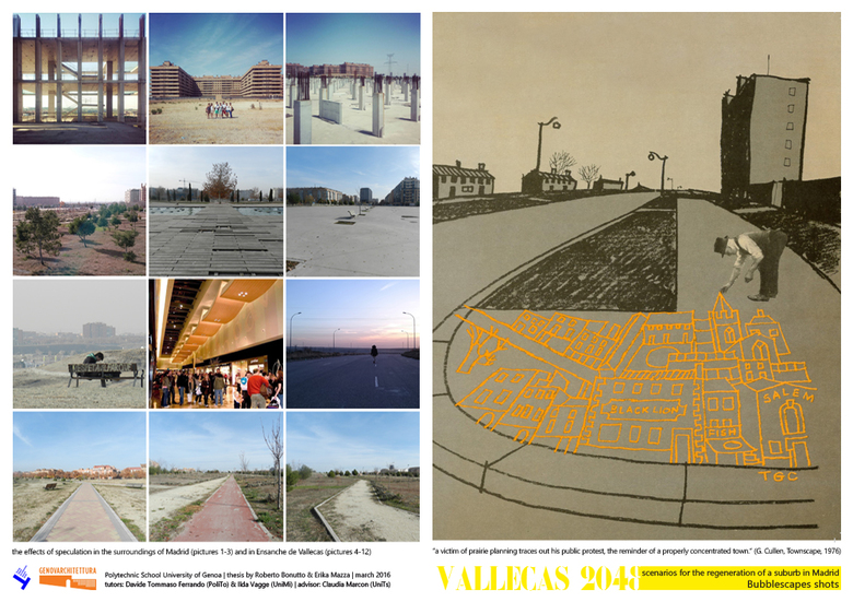 "This project is part of the collective research "Bubblescapes - project for the reuse of the landscapes produced by the Spanish housing bubble". Our thesis is meant to improve the structural conditions of a suburban district in Madrid: Vallecas, which offers an exemplary case study of the European urban and economic dynamics of the last thirty years."