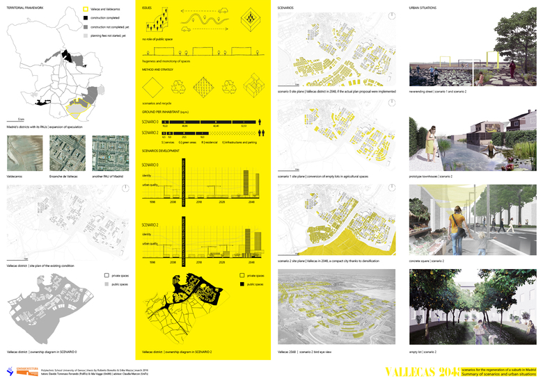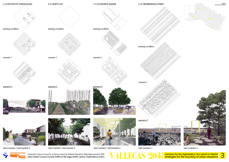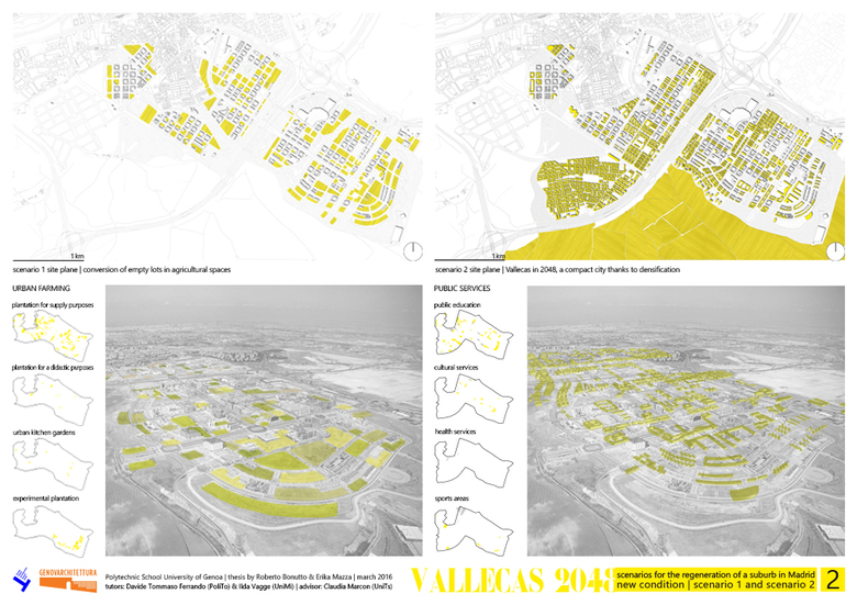 The selected working method consists in proceeding through "scenarios". Two scenarios have been developed: the first one requires an exiguous expense, but it is immediately viable; the other one may be finished by 2048, with a higher investment. 2048 represents a crucial year, it will occur exactly 50 years after "ley del todo urbanizable" -which opened to the possibility of converting agricultural land into building spaces- and 40 years after the burst of the Spanish real estate bubble. The first scenario involves the conversion of empty lots in agricultural spaces, while waiting to be edified. Thanks to the temporary reuse of these areas, the sense of incompleteness that pervades Vallecas will be attenuated, reintroducing the farming practice, identity sign of the district until 2000.