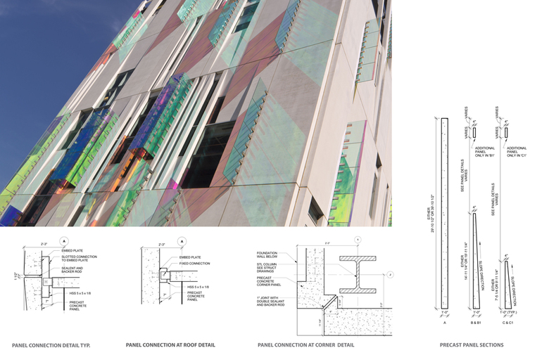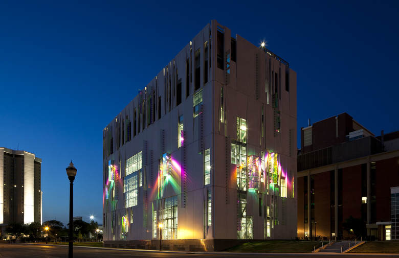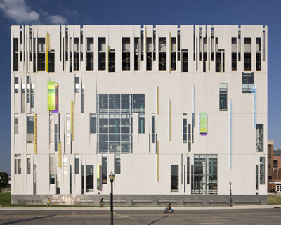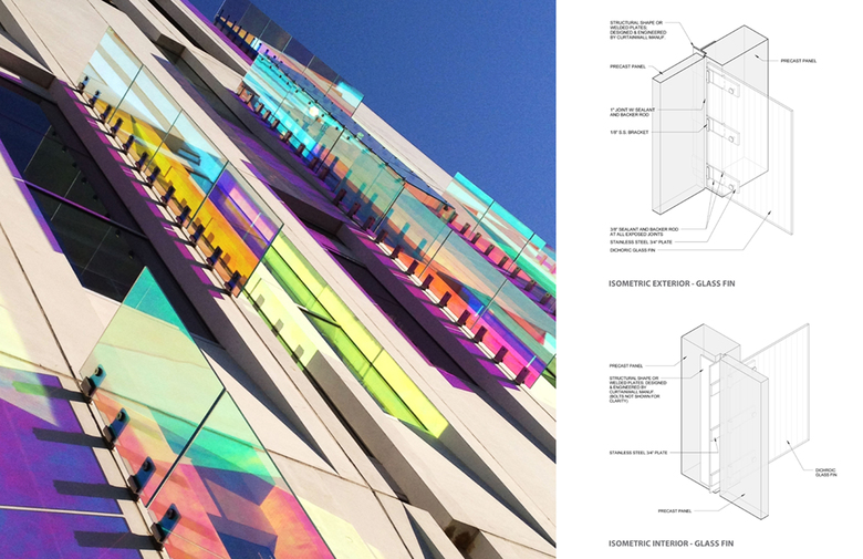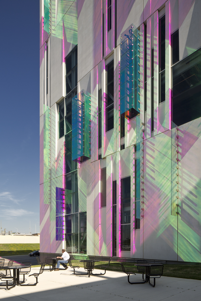 Conceived of as a “House for Energy,” the LEED Silver Certified building, has an envelope that showcases the energy-efficient chiller equipment inside and records the sun’s energy on the exterior. Glazed openings are specifically located to frame views of the chiller equipment, and dichroic glass fins and boxes change in color with the movement of the sun and cast color-changing shadows onto modular precast concrete wall panels that have been polished to a high sheen. The result is a dynamic façade that changes with the time of day, season and the location of the observer.