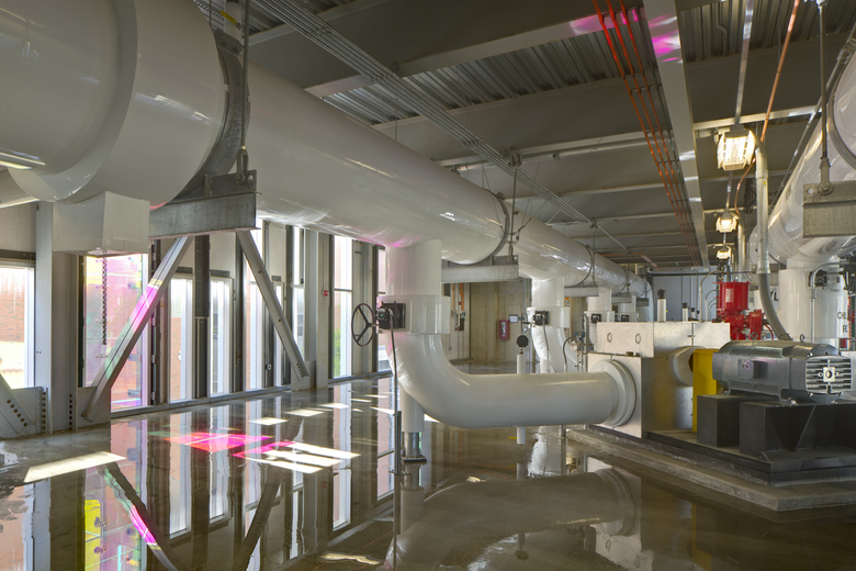 Functionally, the facility minimizes the visual, noise and vibration impact of large equipment: chillers, cooling towers, transformers and generators. The plant provides 30,000 tons of chilled water for the adjacent medical center facilities and will accommodate future campus cooling demands. To increase reliability, the plant has been equipped with an emergency power source to provide chilled water for critical operations during power outages.
