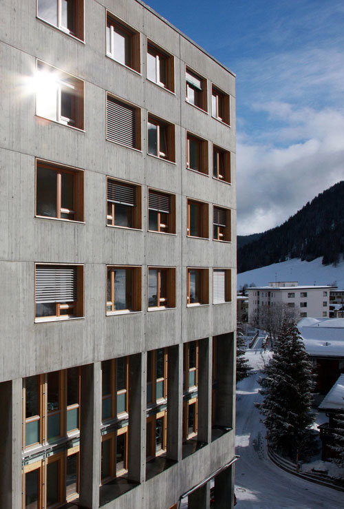 Das bestehende Betongebäude aus dem Jahr 1977 mit seiner Lochfassade wird in der Nordwestecke ergänzt und bildet, in analoger Ausführung zum Vorhandenen, im Endzustand einen nahezu perfekten Würfel. Zwischen Spitalbau und Pflegeheim wird ein neuer Gebäudeteil eingefügt. Dieser hat einerseits die Aufgabe, die beiden unterschiedlichen Funktionsbereiche räumlich zu trennen, bildet aber gleichzeitig für die Bewohner und Mitarbeiter mit Empfang, Cafeteria und Kiosk einen wichtigen Knoten- und Treffpunkt. Die differenzierte Gestaltung als transparenter, leichter Glaskörper macht die funktionale Trennung der beiden massiven Bauten Spital und Pflegeheim optisch deutlich und verstärkt die einladende Wirkung in seiner Funktion als Haupteingang und Empfangsbereich.