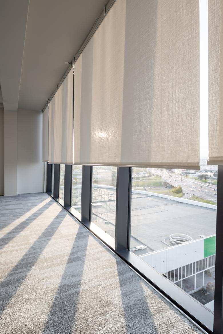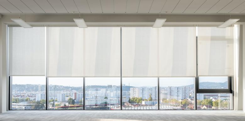 Soltis Touch als neueste Innovation von Serge Ferrari ist ein technisches Sonnenschutzgewebe, das durch seine besondere Webtechnik mit Rohmaterial wie ein Textil aus Naturfasern aussieht. So entsteht gerade in Büroräumen auch bei sehr großflächigen Screens eine sehr behagliche und wohnliche Atmosphäre. Darüber hinaus überzeugte es durch eine hohe Reduktion der Wärmetransmission und leistet einen wertvollen Beitrag zur Energieeffizienz des Gebäudes, das eine BREEAM-Zertifizierung* auf ausgezeichnetem Niveau erhielt. Ein wichtiger Aspekt für die Büroräume war auch die hohe Schallabsorption des Sonnenschutzmaterials, das den akustischen Komfort im Raum spürbar erhöht. Auch beim Brandschutz bietet Soltis Touch ein hohes Niveau durch seine Zertifizierung nach Euroklasse B-s2,d0 nach EN 13501-1.