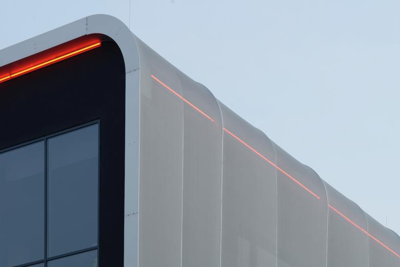 Die besondere Form erhielten die beiden seitlichen Fassadenflächen durch Facid 65 Profile von Schüco, die fertig gebogen und zugeschnitten auf der Baustelle angeliefert wurden. In diese wurden die vorab konfektionierten Textilfassadenbahnen aus Frontside View 381 eingezogen, die sich durch ihren biegeleichten Charakter an sämtliche Linienführungen und Kurven anpassen lassen und so eine hohe Gestaltungsfreiheit für den Architekten bieten. Durch die patentierte Précontraint Technologie, bei der das Material während des Beschichtungsprozesses von allen Seiten vorgespannt wird, erhält das Gewebe eine besondere Dimensionsstabilität, sodass es weder während der Installation noch in der späteren Anwendung zum Verziehen oder Ausbeulen kommt und somit immer eine optimale Gewebespannung erreicht wird.