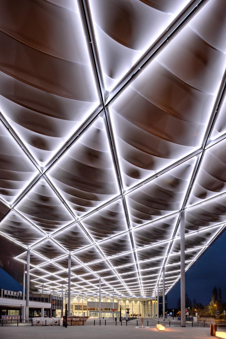 Die polygonale Form des 170 Meter langen und bis zu 93 Meter breiten Vordachs erzeugt einen dynamischen, architektonischen Körper, definiert sich aber allein durch den dreieckigen Verlauf des Messegrundstücks. Rhombenförmig angeordnete Kissen aus transluzentem Glasfasergewebe erzeugen eine lebendige Dachstruktur. Insbesondere bei Einbruch der Dunkelheit, wenn die einzelnen Kissen illuminiert sind, tritt die spannungsvolle Materialität des Gewebes noch deutlicher hervor.