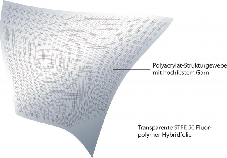 STFE ist ein bisher einzigartiges Gewebe aus Polyacrylatfasern mit sehr hohem Öffnungsgrad (50 bis 60 % Offenheit), das mit einer transparenten Beschichtung versehen ist. Durch die großen Abstände der Einzelfäden ist der Gewebeträger nur im Nahbereich sichtbar und erscheint sonst als homogene, transparente Fläche. Damit entsteht ein Material, das flexibel und leicht zu formen ist und trotzdem eine sehr hohe Transparenz besitzt.