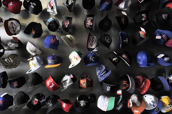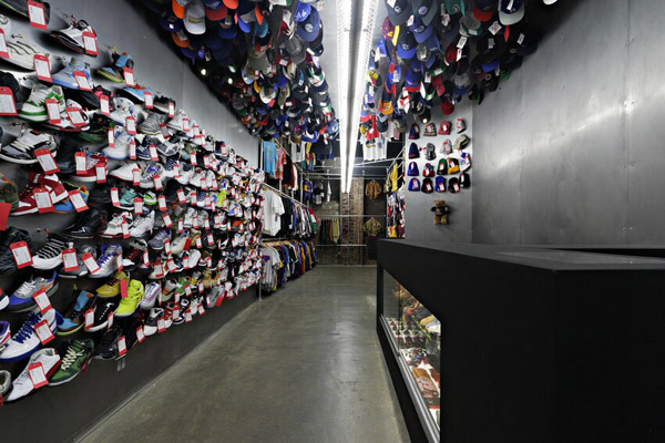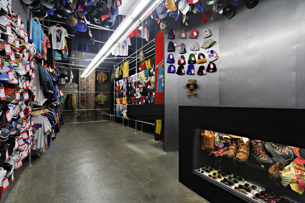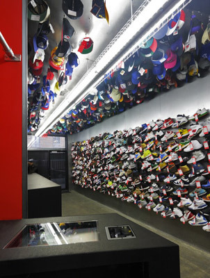 At the front of the store we wrapped the existing walls and dropped ceiling in steel panels. This creates a continuous surface for magnetically-displayed merchandise.  It is a very flexible way to display and allows a varied density and type of product to be displayed in an almost graphic way. The bold tags attached to the merchandise introduce a repetitive graphic rhythm while emphasizing the individualistic nature of Buzzer Beater’s wide collection of luxury sneakers, T-shirts and hats.