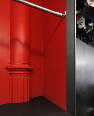 The check-out counter is small and non-hierarchical; promoting a more intimate dialog between customers and employees. Its rubber surfaces offer a playful allusion to the surfaces and textures of athletic equipment and urban streets. An exposed railing above the counter provides a place for merchandise to hang while it is being purchased, adding elements of ritual, convenience, and conversation to the check-out experience.