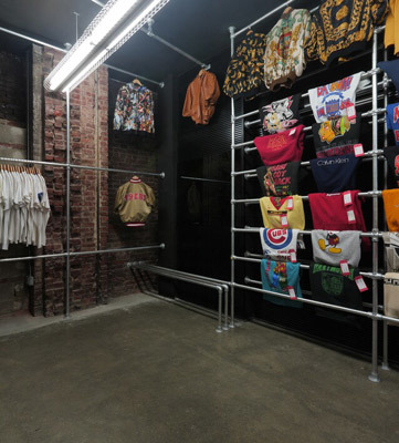 At the back of the store all of the existing walls and ceiling were removed to reveal the brick walls and existing piping and ducts. Instead of concealing these, we added even more pipes. The additional pipes riff off the existing architecture while also creating scaffolding for display.