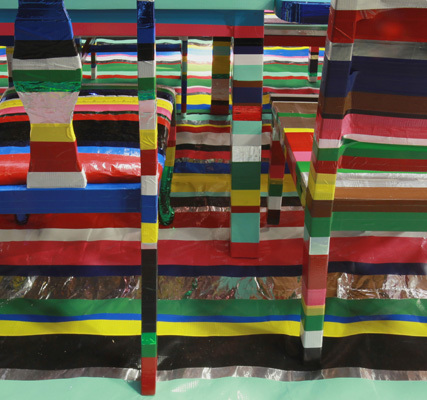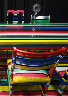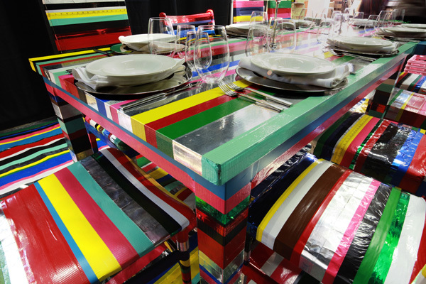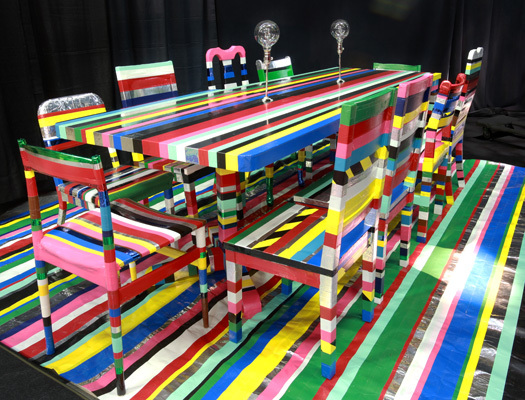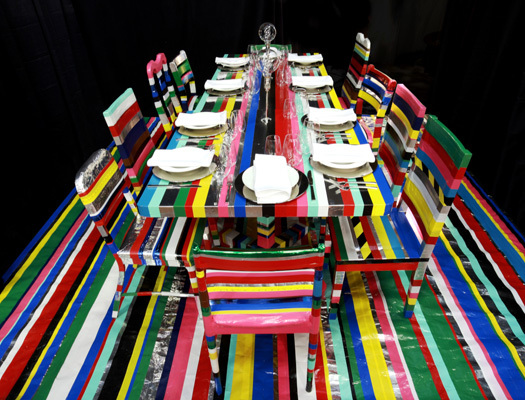 Born Again—In this installation made for the Design Industry Foundation Fighting Aids, we conceived and created an installation that generated no waste. All the pieces excepting the dishes and lights were recovered from garbage around Manhattan and covered in duct tape to unite the disparate objects into a field of color. The rug is duct tape. The lights were designed by Slade Architecture and the dishes were rented.