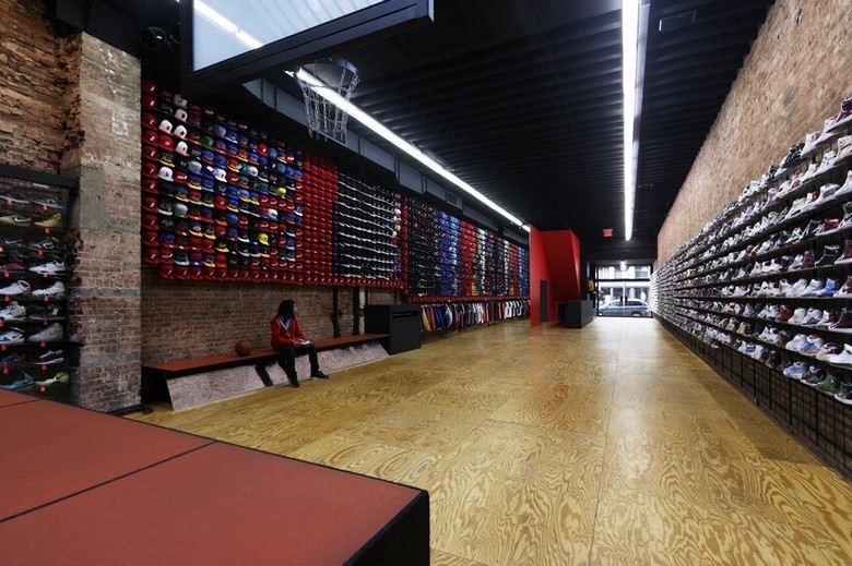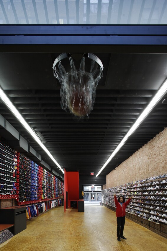 We wanted to use materials as efficiently and simply as possible. Using the existing infrastructure as the backdrop was a great starting point. The other given material was the product. Sneakers, t-shirts and hats are inherently colorful and tactile. We used these as the foreground in the space. They are treated almost as architectural elements. The wall of sneakers comes right out to the street creating a perspective of color from the front to the back. The façade was designed to become an absence of façade presenting the product almost immediately to the street. Two large glass pivot doors define the exterior enclosure which is recessed back from the street to create an open frame between interior and exterior spaces. Because the doors are full width the entire opening can literally be open in good weather.