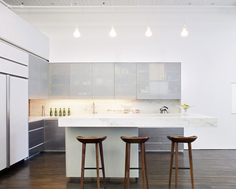 The kitchen island is clad in acrylic and the top is marble- supported by a concealed steel structure.