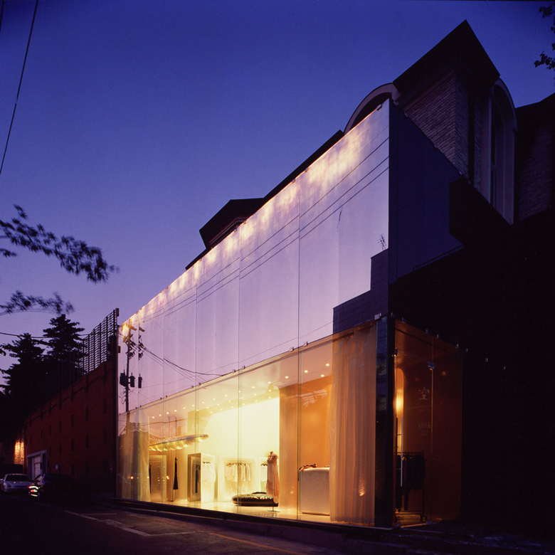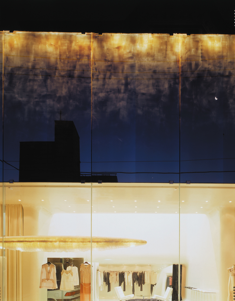 The two rows of glass respond to the shifting day and night conditions. During the day, when the shop is open, the transparent bottom row of glass becomes the primary focus while the top row reflects the sky, keeping its presence discreet.