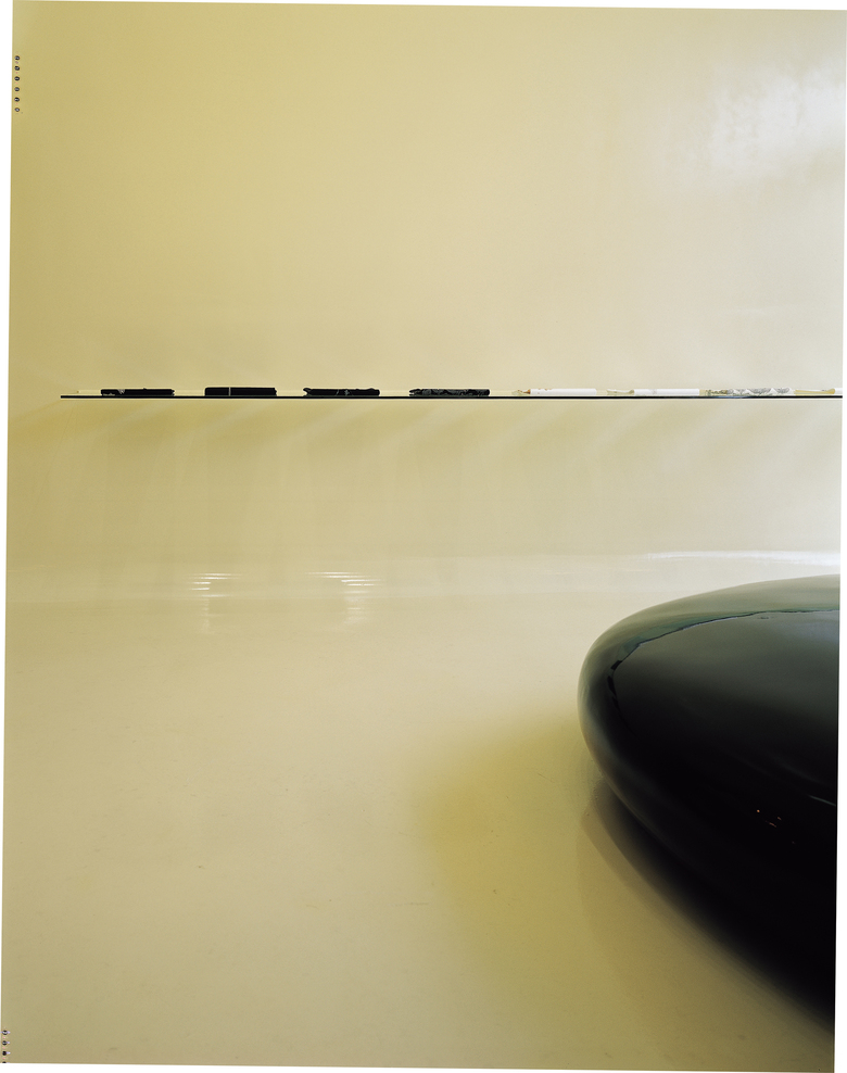 The shiny, low, black display object reveals the height and width of the space and the force of gravity; like a black drop of mercury shaped by surface tension and it’s own weight.