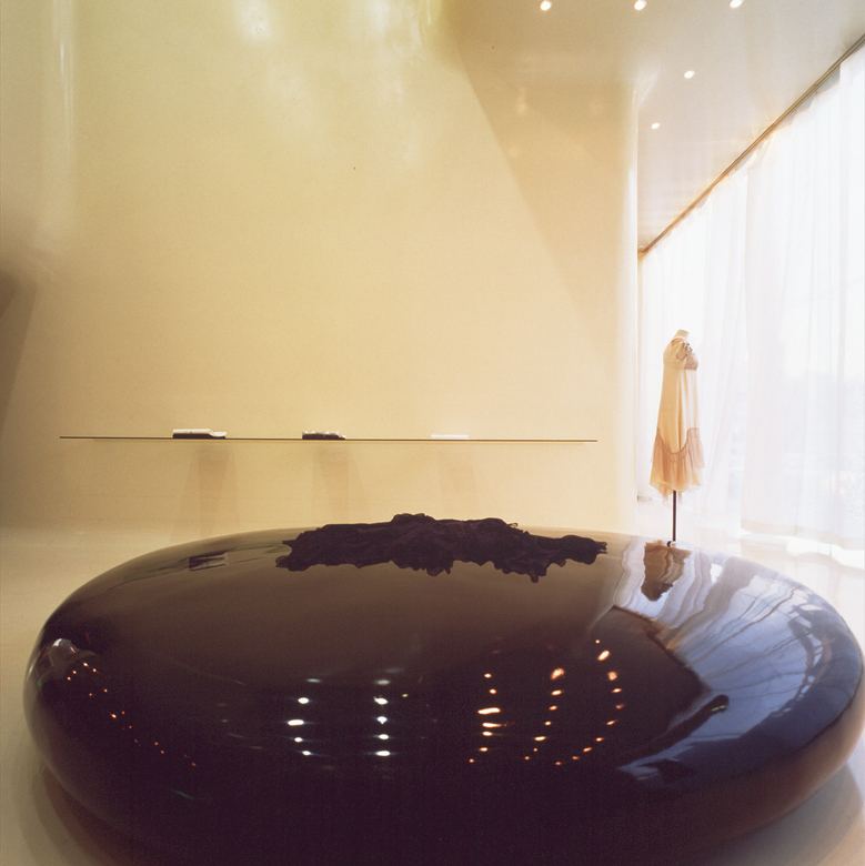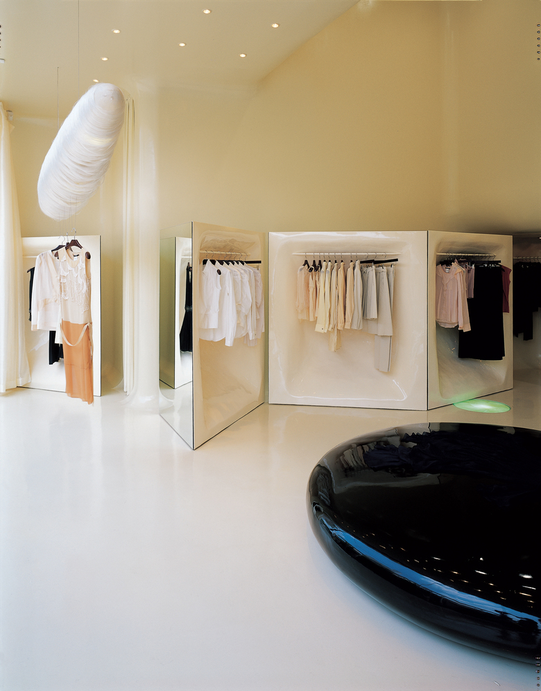 Clothes are displayed using objects in the space. The objects imply a liquid state of suspension within the store, like looking into an aquarium; they appear to float or be shaped by surface tension within the space. The shapes and materials of the objects also reveal different qualities of the space.