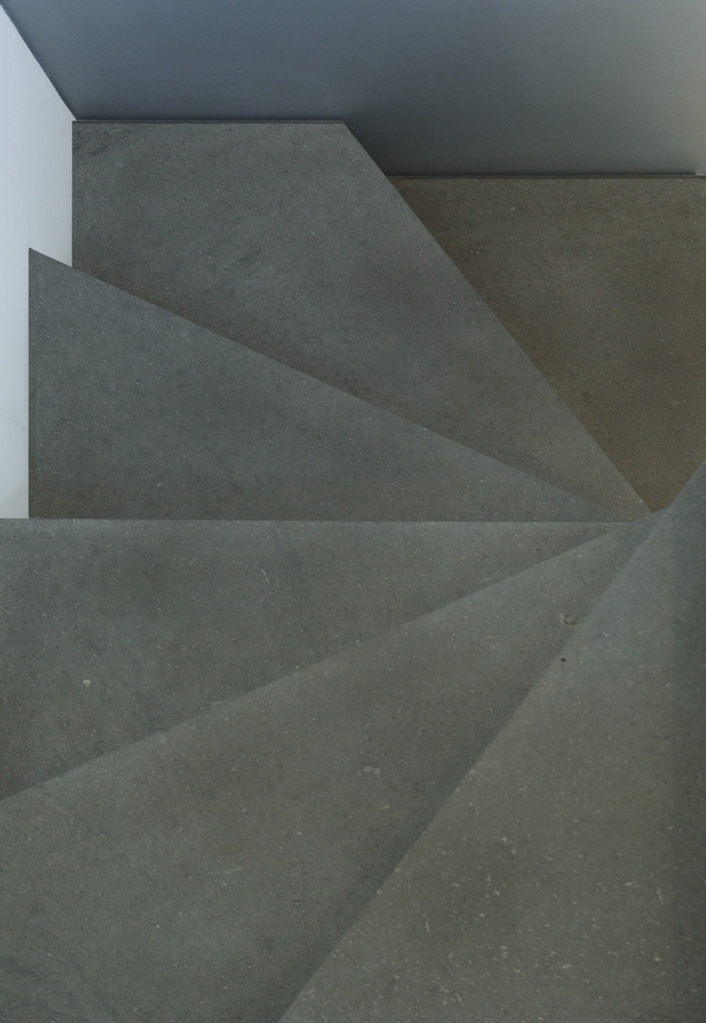 The second floor is set back from the main floor at both sides of the building (east and west) and contains the master bedroom suite. Because of the setback, the stair is in the middle of the lower level at the eastern end of the upper floor. A new window wall at the top of the stairs floods the stair opening with light spilling down into the center of the lower floor. The stair itself is a light aluminum cantilevered structure that bridges across a stone platform at the bottom and a stone and wood stair/kitchen “wall” at the top. The wall of the stair is a 1” thick 3form resin panel that captures the light and diffuses it so that the interior wall appears to be glowing with the exterior sunlight coming through the new full width glass opening.