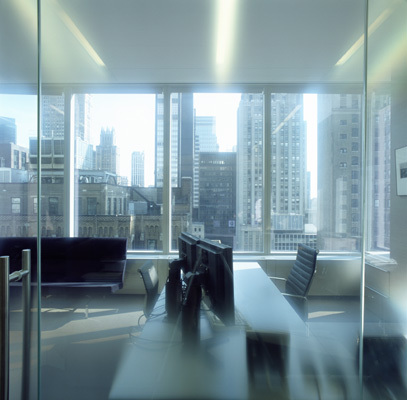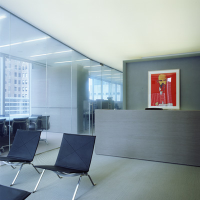 This 23rd floor, penthouse office space in a new building was renovated for a successful hedge fund company. The client is also an art collector who wanted an office space that presented a serious business atmosphere and uncompromised functionality while also reflecting his personal interest and involvement in contemporary art and culture.