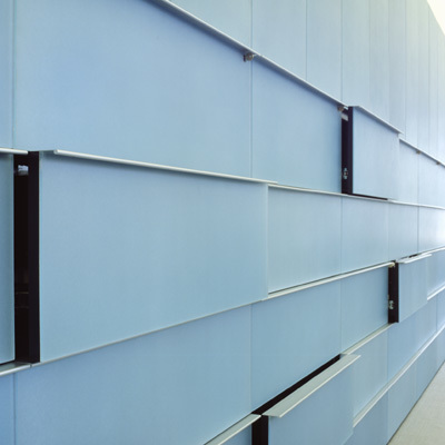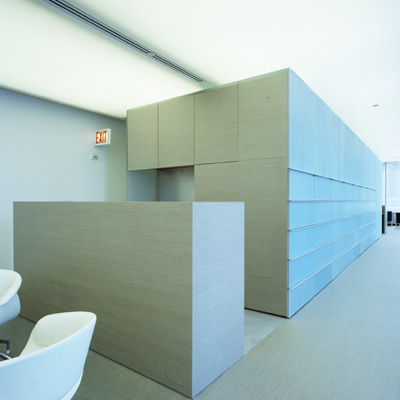 The volume that separates the elevator lobby from the space contains the server room, copier and kitchen and is clad in a translucent blue acrylic (Liteblocks) with an iridescent finish that changes the color of the material as you move next to it. This translucency and iridescence create a sense of depth in the surface of the object.