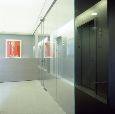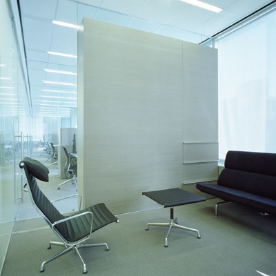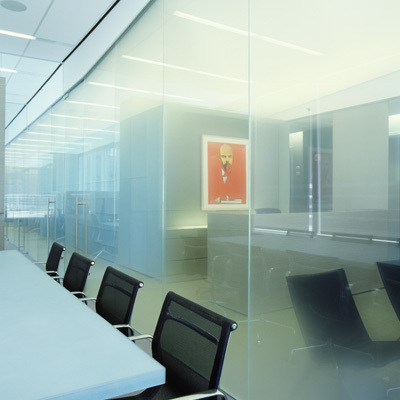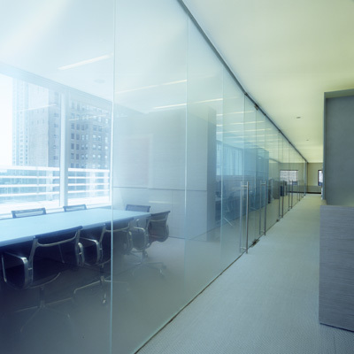 Creating a continuous glass wall parallel to the curtain wall allowed direct views out while accommodating the need to have enclosed offices. In order to emphasize the view out and erase the objects in the foreground we used Lumisty view control film laminated between low iron glass panels. The film blurs views at angles greater than 25 degrees from perpendicular. Oriented so that the blurring occurs vertically, the ceiling and floor are blurred while maintaining a clear view on the horizon line. Upon entering the space from the elevator lobby the glass plane appears transparent. The closer one moves toward the wall the more the ceiling and floors blur until the entire desk space and ceiling are blurred leaving only the view outside clear. This simple but effective strategy creates a hazy, cloud-like effect above and below eyelevel as one moves through the corridor parallel to the glass wall.