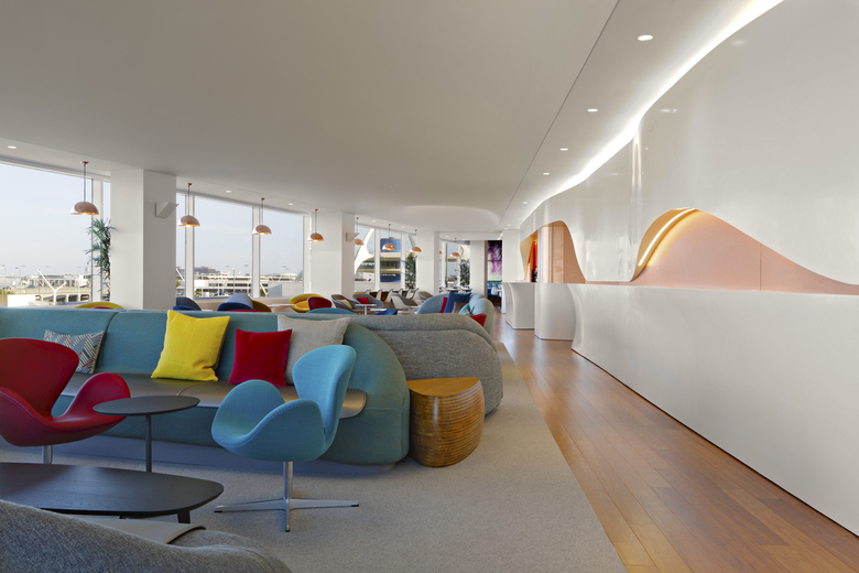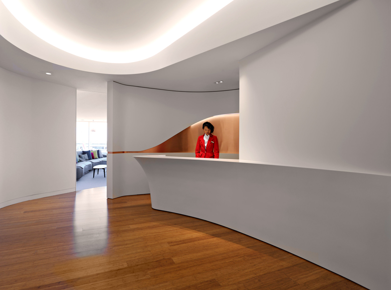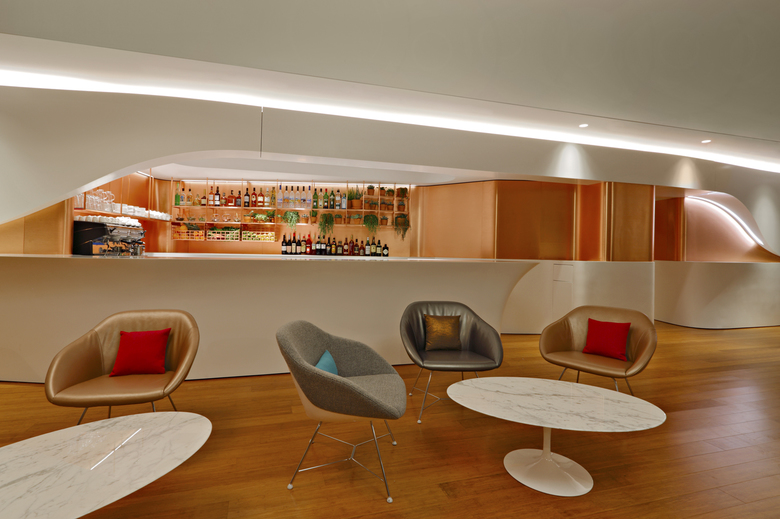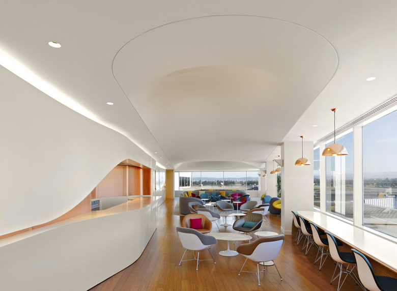 The lounge recalls LA’s warm sunsets, flowing surf, laid back lifestyle, mountain backdrops, smooth curves and sculpted surfaces.  The reception area envelopes guests in a calm, cleansing environment sheltered from the bustle of the terminal.  Leading into the main lounge is a sculpted Corian and copper Flow Wall that continues into the space and cuts diagonally through the lounge as a backdrop for the Clubhouse opposite continuous views that include aircraft, LAX’s iconic Theme Building, runways, the Hollywood Hills and the Hollywood sign.