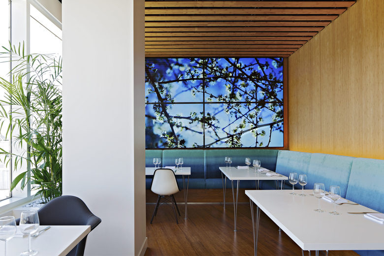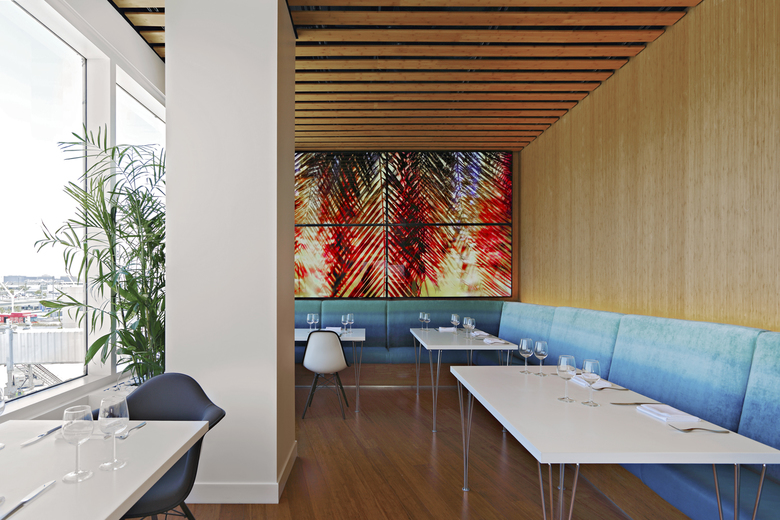 The apex of the triangular lounge space, beyond the tip of the Flow Wall, encloses The Conversation in warm bamboo lines walls and ceilings framing the Diana Reichenbach video installation.  Leather banquets lining this room provide an intimate get-away within the clubhouse. This is the perfect place to enjoy an inspired Virgin Atlantic crafted dinner inspired by Californian lifestyle.