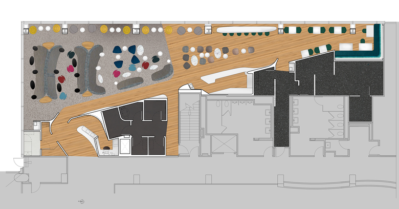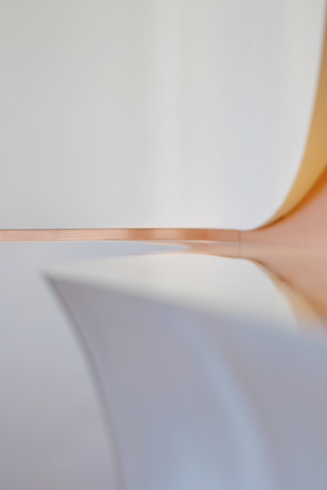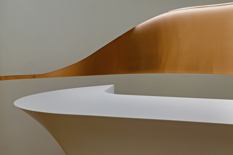 The sinuous Flow Wall defines a distinct variety of spaces each furnished to provide varied seating and social possibilities within the triangular shaped lounge volume.    At the widest part of the triangle, this space is defined by custom designed landscape-like sculpted couches and end tables that provide a variety of relaxed seating that recalls dunes and rolling hills at the glass corner of the lounge facing views of the Hollywood Hills and mountains beyond.  Swan chairs by Arne Jacobsen compliment the sculptural language in this area.