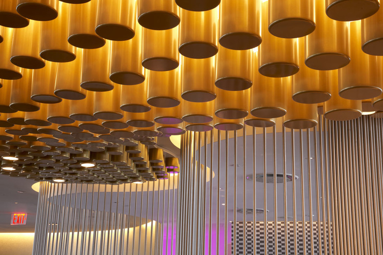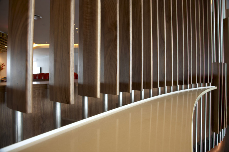 The 10,000sf Clubhouse is bounded on two sides full height expansive views over the jetways and Virgin aircraft immediately below. In the center of the lounge, the cloud shaped cocktail bar is enclosed by a diaphanous, curving "wall" of stainless steel rods and walnut fins; mediating views from and through the space and creating a series of distinct spaces. This is the heart of the lounge around and through which guests move in a rhythmic syncopated flow to the many unique amenities that passengers have come to expect from a Virgin Atlantic Clubhouse.