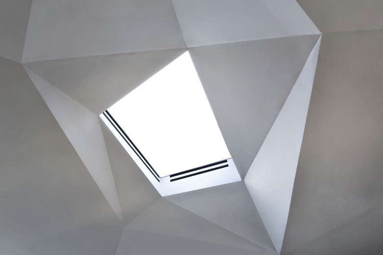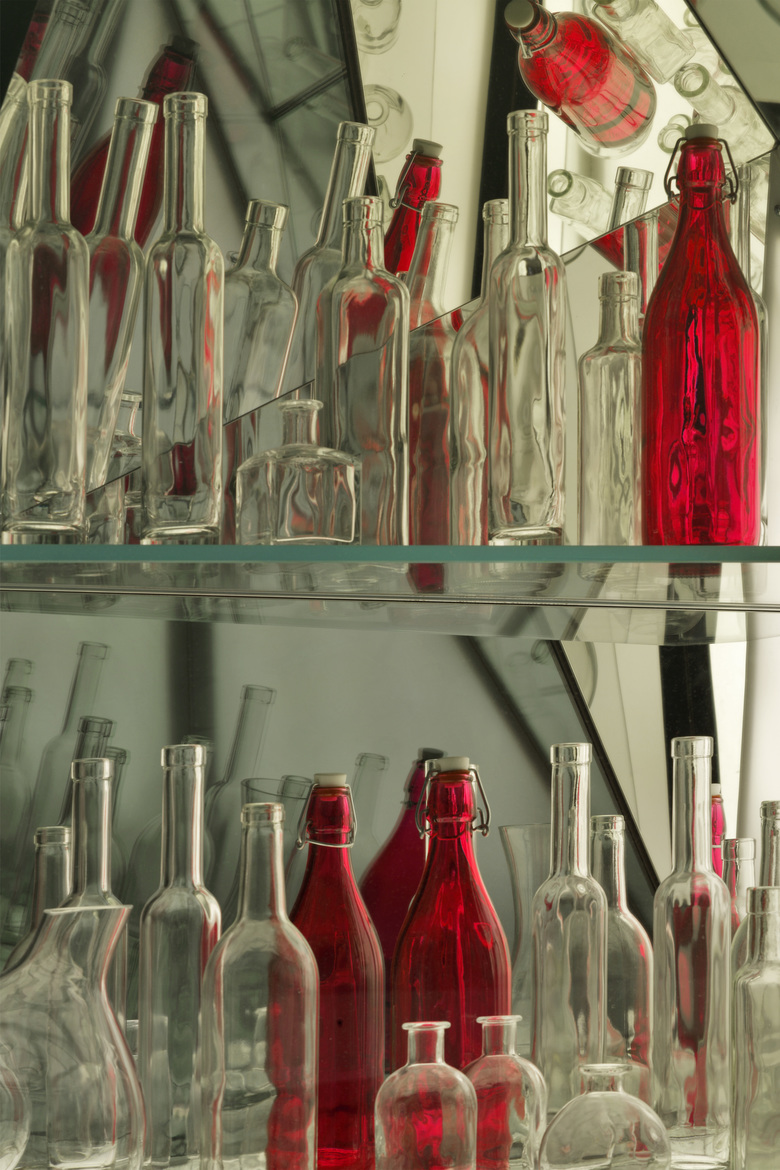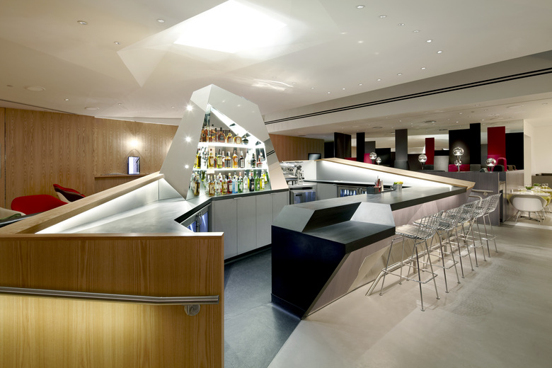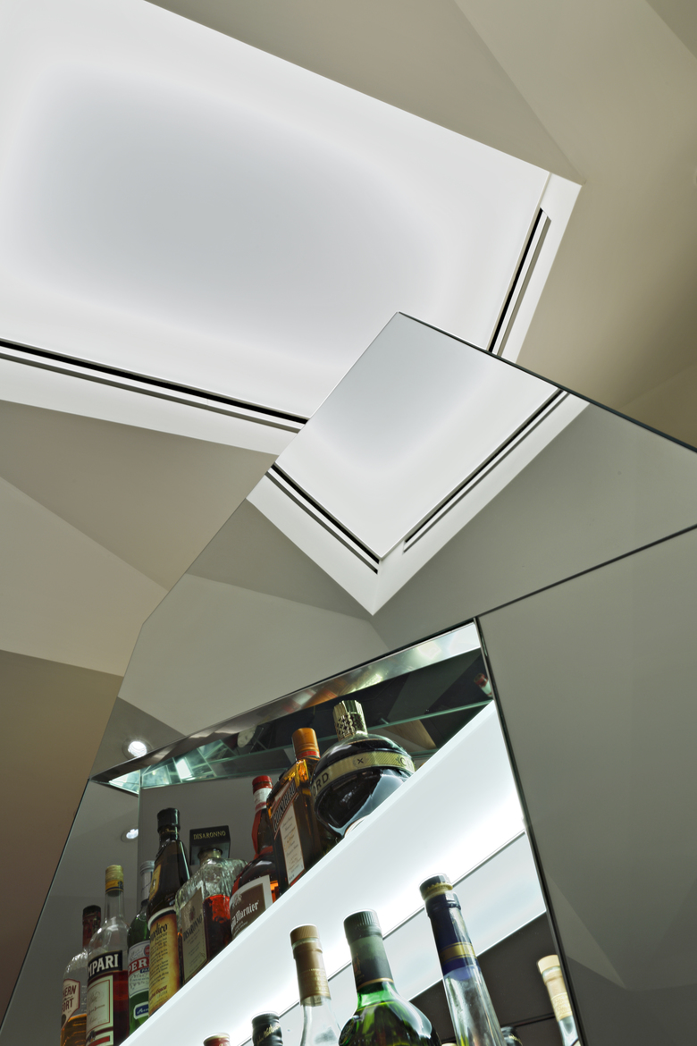 The Clubhouse is organized around a faceted bar in the center of the lounge, culminating in a crystalline bottle display under the central skylight. The geometry of this object ripples across the ceiling; an abstract geometric canopy that spills up into the two skylights.