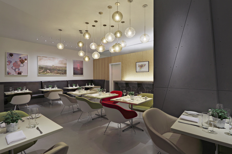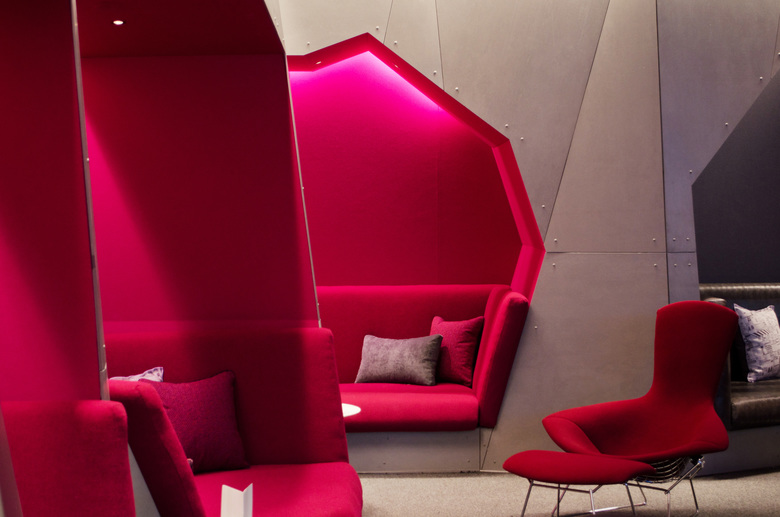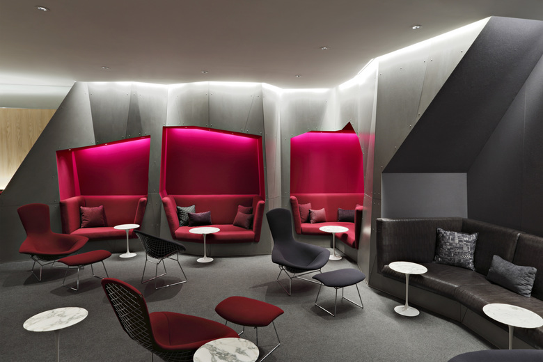 A series of distinct spaces pin wheel around the bar. Each space references an iconic downtown typologycafé, theater, art gallery, restaurant, club, bar, lounge. Grab a coffee and read a book or magazine in the wood lined café. Venture into the curtain wrapped screening room to catch the latest art house video. Curl up in an upholstered pod, carved into protective faceted concrete of the passion pit. Pull up to the bar at the liquid lounge. Sit down for a  delicious meal in the gallery-like brasserie. Catch up on your email or listen to music in the colorful origami lounge.