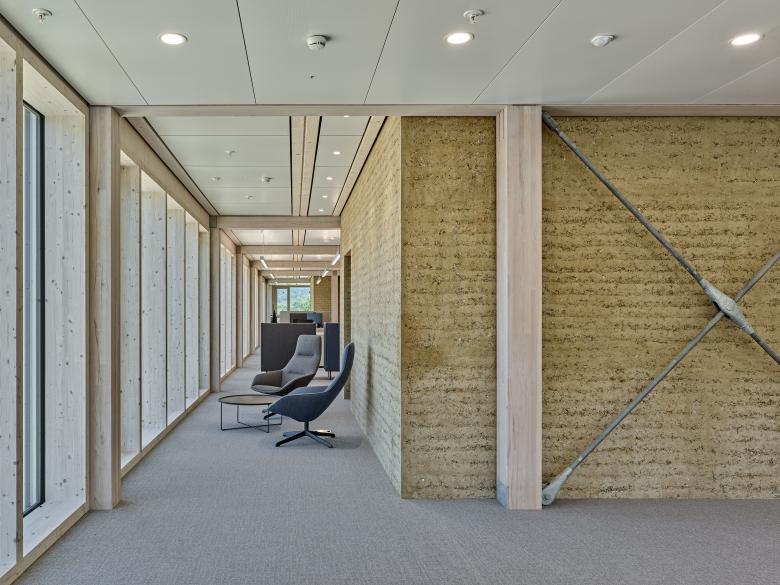 Das stark wachsende Unternehmen Erne AG Holzbau verdoppelte in nur zehn Jahren die Anzahl der Mitarbeitenden auf 330. Um aktuellem und künftigem Platzbedarf sowie zeitgemässen Organisationsformen gerecht zu werden, investierte das Holzbauunternehmen in einen Büroneubau am Standort Stein. Unter Einbezug des bestehenden Modulbaus entstand ein neues räumliches Ganzes mit Innenhof, in dem sich offene Raumsequenzen mit den Raummodulen des Bestandes zu einer flexiblen Bürowelt ergänzen. Dabei bildet die horizontale Erschliessungsfigur zusammen mit den zentral im Atrium liegenden Treppen und Verbindungsbrücken ein Kontinuum, welches die vertikale Verbindung zum im Erdgeschoss liegenden «Marktplatz» schafft.