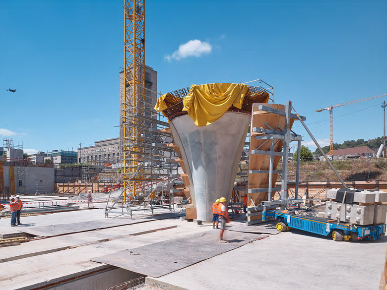 Der von ingenhoven architects entworfene neue unterirdische Bahnhof besticht insbesondere mit Helligkeit und einer visuellen Offenheit, die Ästhetik und Sicherheitsvorteile verbindet. Der neue Bahnhof besitzt eine rein auf Druck belastete, weiße Betonstruktur mit minimaler Aufbauhöhe. Die Stärke der optimierten Schalenstruktur wurde auf ein Hundertstel der Spannweite reduziert, was einen erheblich geringeren Materialeinsatz ergibt. Wiederverwendbare Betonschalungen und modulare Fertigteile erhöhen die Effizienz der Bauarbeiten. Ein eigens entwickelter Spezialbeton macht die architektonische Struktur durch Sichtbetonflächen, die ohne Brandschutzverkleidung auskommen, offen erkennbar.