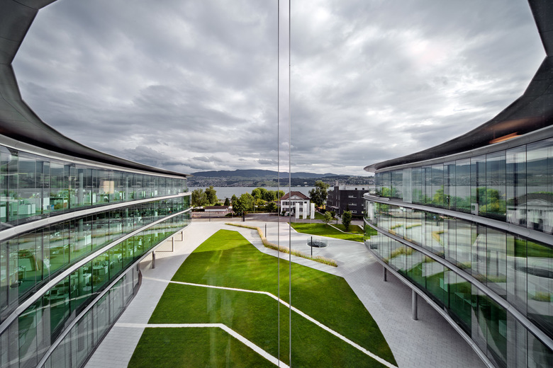 Der elegant gewölbte Bau bietet fast allen 500 Mitarbeitern gut ausgestattete Arbeitsplätze und Workstations mit Seeblick. Das Gebäude setzt umweltgerecht auf natürliche Ressourcen und erfüllt die Anforderungen des schweizerischen Öko-Standards Minergie®. Ein Energieverbrauch von weniger als 40 kWh/Jahr/m2 für Heizung, Kühlung und Elektrizität konnte erzielt werden, indem das Seewasser für die Heiz- und Kühlleistung genutzt wird – als erstes außerstädtische Gebäude am Zürichsee überhaupt.