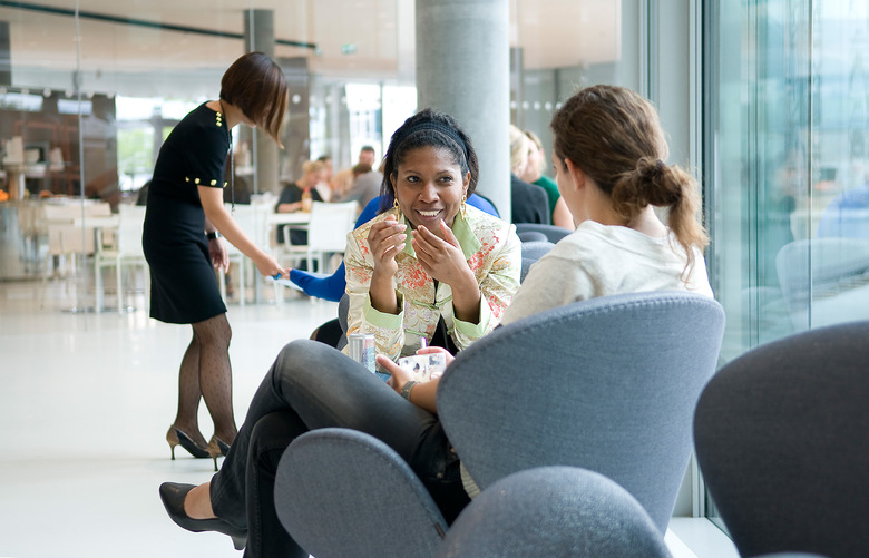 Zur Verbesserung des Raumakustik sind die Decken mit einer speziellen Absorptionsschicht verputzt, die dennoch eine thermische Aktivierung der Betondecken erlaubt. Für die doppelschalige Fassade wurden neue Detaillösungen erarbeitet, die die natürliche Belüftung der Büroräume ermöglichen. Unter dem aufgeständerten ersten Obergeschoss befinden sich neben dem Eingangsfoyer mit Lounge, Restaurant und Konferenz- sowie Workshop-Räumen. Die Büroräume in den Obergeschossen sind bis zu 70 Prozent als offene Großraumbüros ausgelegt. Die deckenhohe dreifachverglaste Innenfassade hilft als Wärmepuffer zwischen den beiden Fassadenschichten, Energie zu sparen. Als Sonnenschutz kommen Metalljalousien zum Einsatz, die vor blendendem Licht und Hitze schützen und dennoch freien Ausblick gewähren. Dieser Sonnenschutz ist von einer äußeren Glasfassade vor Wind und Regen geschützt. Um die natürliche Belüftung der Büroräume zu verbessern, sind die Fassaden mit Luftklappen ausgestattet. Die zwei Holzterrassen und das begrünte Dach der zurückversetzten obersten Etage geben den Blick auf die Alpen frei. Die beiden unterschiedlich langen, verglasten Flügel des Gebäudes spiegeln sich ineinander wieder, wie in einem Kaleidoskop.